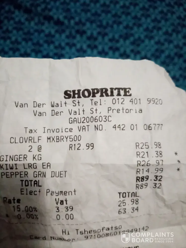 I bought one clover mixed berries juice at shoprite, Van Der Walt Street in pretoria when I get home and check till slip found out that I've been charged one item twice and there was no way I could go back I'm staying far from town.