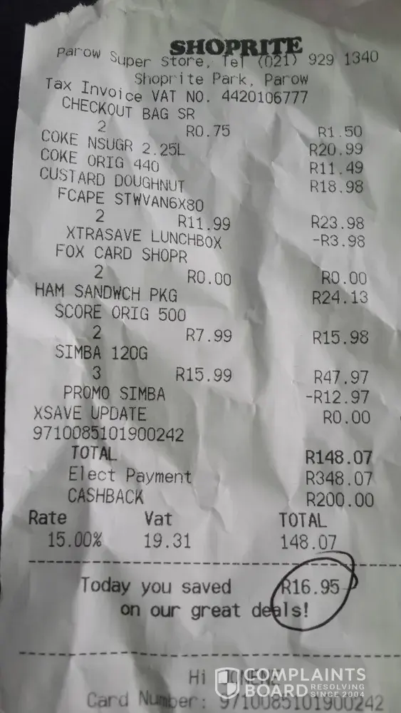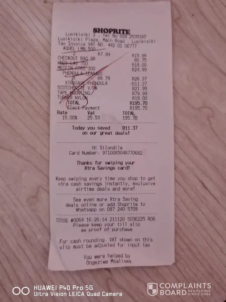 On 23/11/2020 ar 13:02, I paid for 3 boxes of Fry's Veg Burgers, R100 with the xtra savings card at Shoprite, Eerste River Mall, CT.