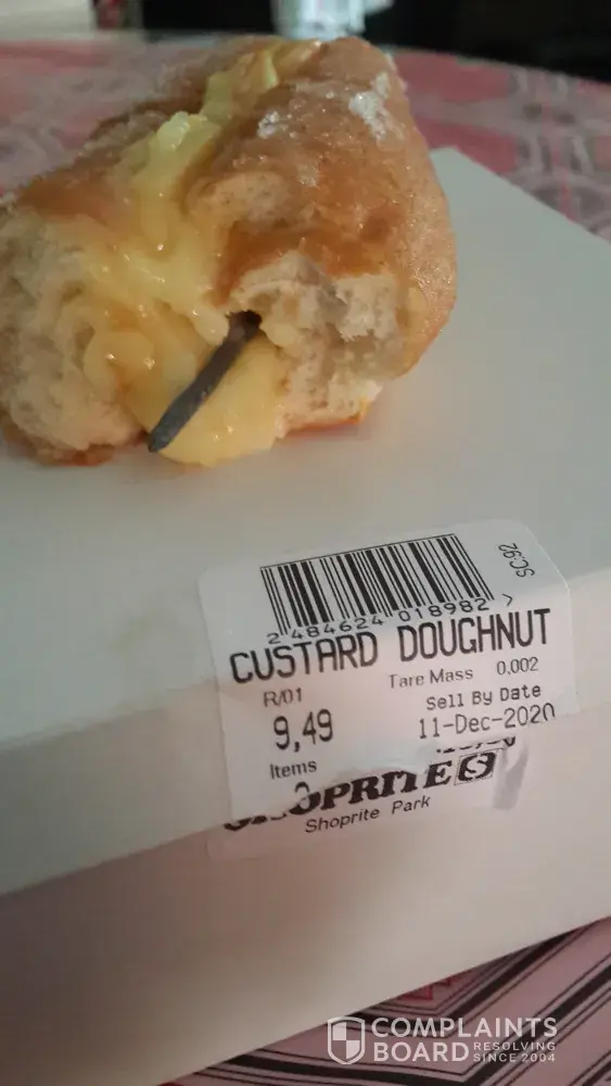 I just bought some things at Shoprite in China town Parow store and just got home to enjoy the donuts I bought from the store, only to find that there was a piece of iron or what looks like a nail inside one of the custard donuts.