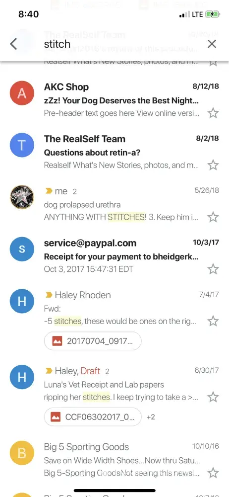 We believe that this absolutely MUST have been written by a competitor. We have the proof that we don’t have any records of any owners named Dee accept one repeat very very happy owner (screen shot of our email search above). We have no records of ever having a puppy named Stitch. Screen shot of our email search for the name Stitch above. We have no records of anyone contacting us with any situation related to this. We have no records of any puppies reported with pneumonia or being lost at 2 yrs old. This person refers to their beloved dog as “it” & why would they buy a second puppy right after getting a sick one?