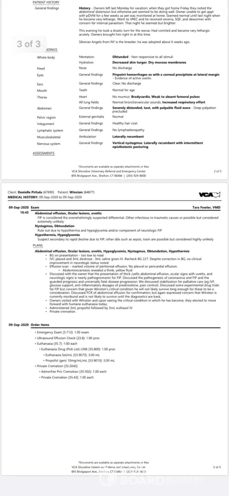 Wednesday September 9th I found him hiding in our bathroom unconscious and rushed him to a closer animal hospital. He was diagnosed with FIP which is a fatal disease for kittens, and more common in catteries. I informed Lili that I was at the animal hospital so she could inform other owners from his litter. Her response was to inform me as my kitten was dying that if I wanted a refund or another kitten, I would need to spend another $600 for an autopsy.