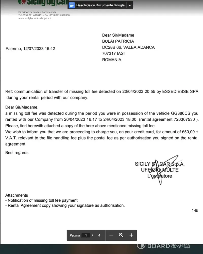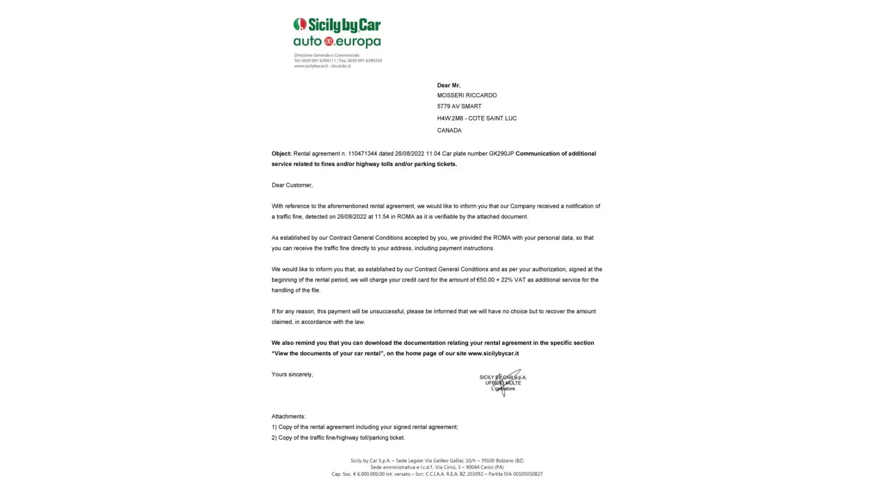 as per attachements you share, SBC has already provide you all the related information about your file. As per T&C you accepted at the desk, SBC is authorized to charge client's card for the amount related to the handling fee for each traffic fine received by the Authority. Our Finde Department will proceed to provide all customer's data to the Italian Authority in order to re-notify to client's home address the original fine registered under his/her name. Also, client will receive all the info and timing to pay the fine.