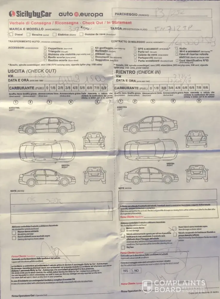 This is not correct - the car is 100% ok, I drove it til Val Thorens and back and 7 days the car stood in the garage of the hotel. I took a look at the car when I arrived in Torino Caselle and there were no scratches on the car, it was everything ok - exactly what also the Sicily by Car guy was confirmed me after he went in the parking place to check.