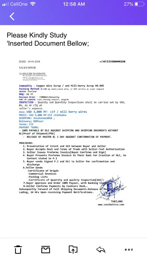 I advice all sellers to avoid this man and his company, he is known to fraud companies with fake lc which banks reject and he will never pay for commodities> be warned.