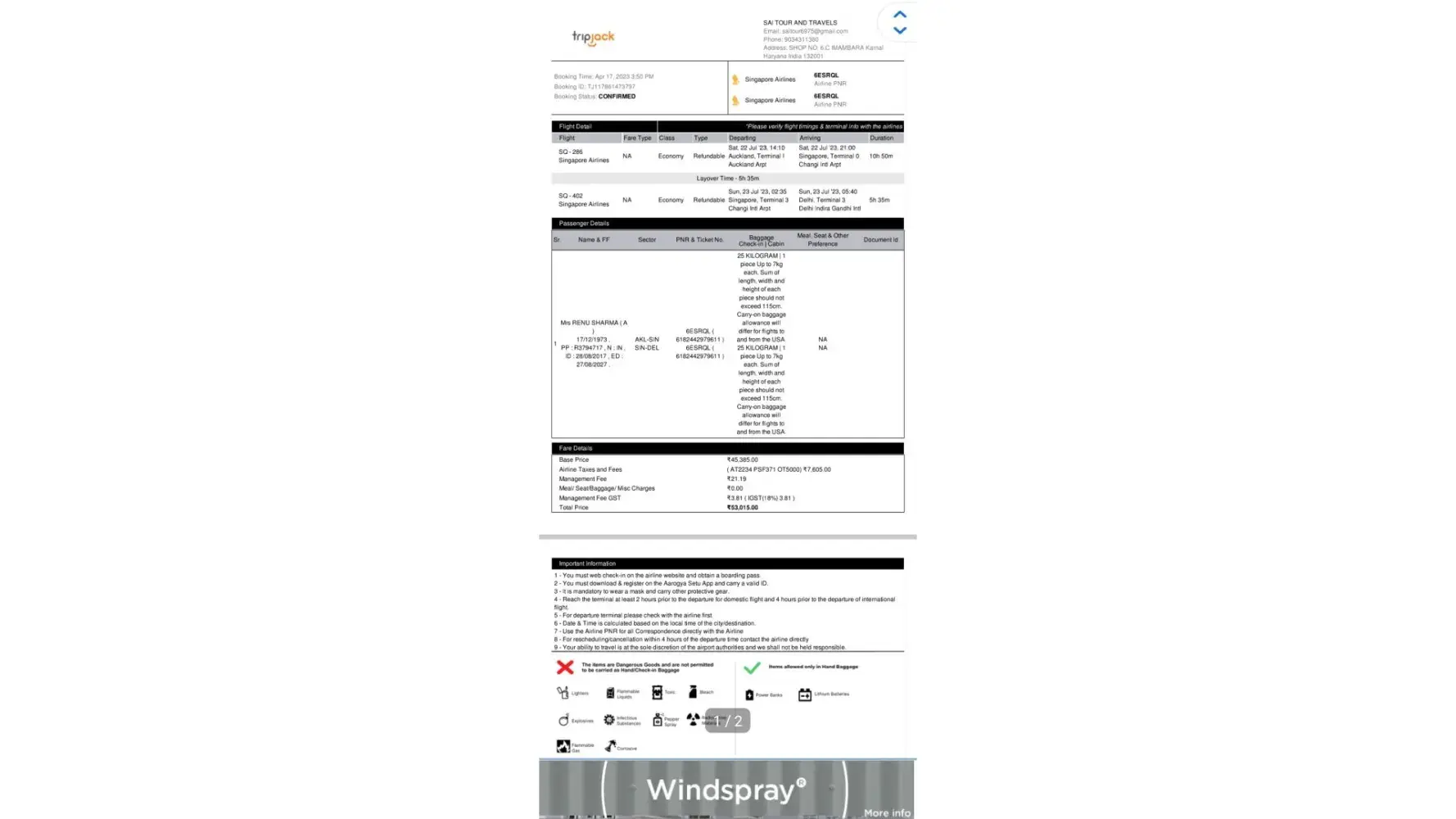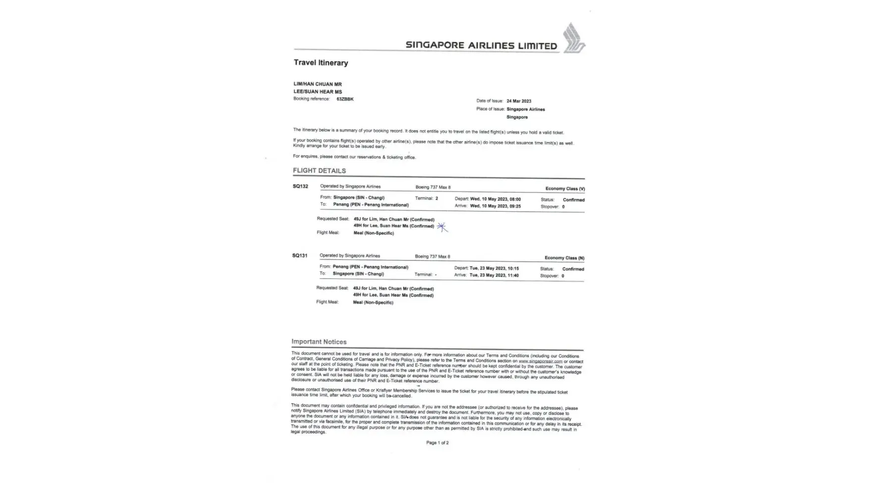 Singapore airlines PNR - 53TVBF