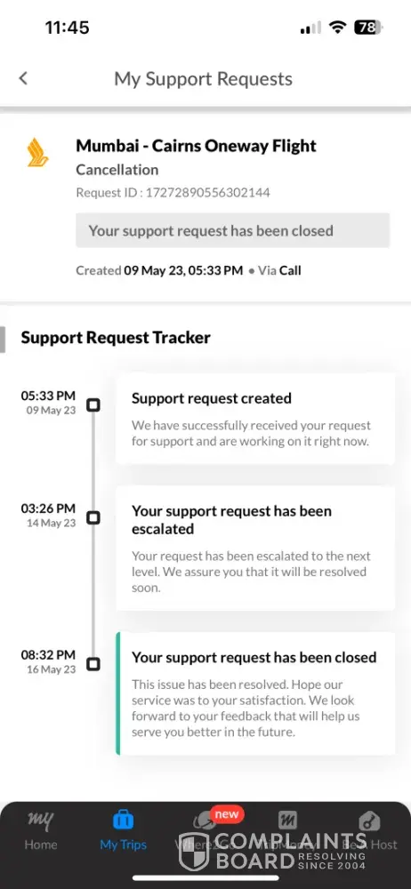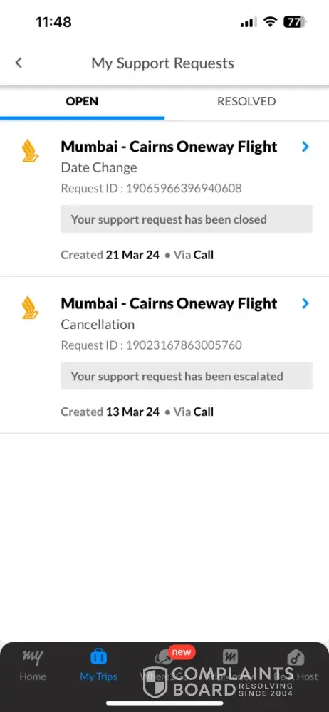 Last year, on March 28th, 2023, I made a booking through MMT for a flight from Mumbai to Cairns, Australia, with the intention of traveling on May 27th, 2023. Unfortunately, due to unforeseen circumstances, I had to cancel my travel plans and keep the tickets open for future use.