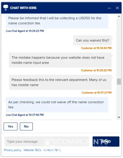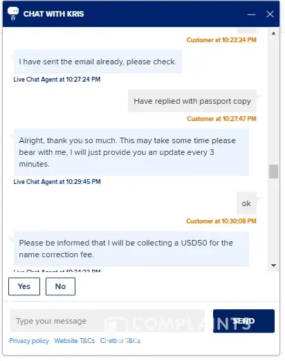 ought a 2 way business class ticket with SQ costing SGD 9,000. When making the booking , the browser auto complete the middle name as last name. I request the change to the correct surname and I was asked to pay USD 50 for surname change. USD 50 is a small sum of money compared to the air ticket but SQ insist on charging while my experience with other airlines are much more gracious, I was never charged once for the same situation before.