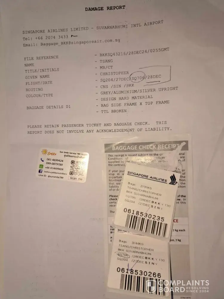 On travelling from Cairns to Bangkok via Singapore one of our luggage was damaged. The Singapore Airlines Baggage Handling Staff were helpful in processing our claim after noting and processing our luggage claim. They informed us Singapore Airlines would be in touch. However to this day we have not heard of any follow up. Here is the email I sent...