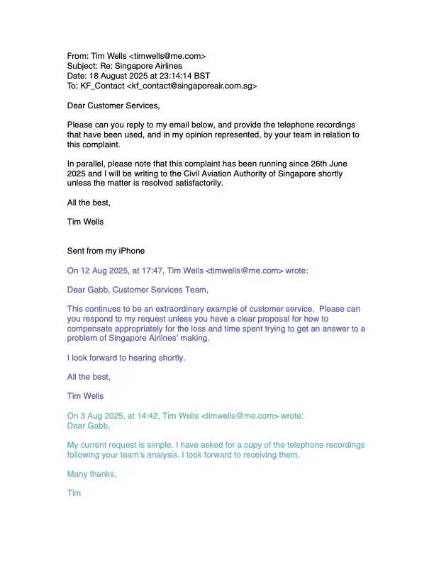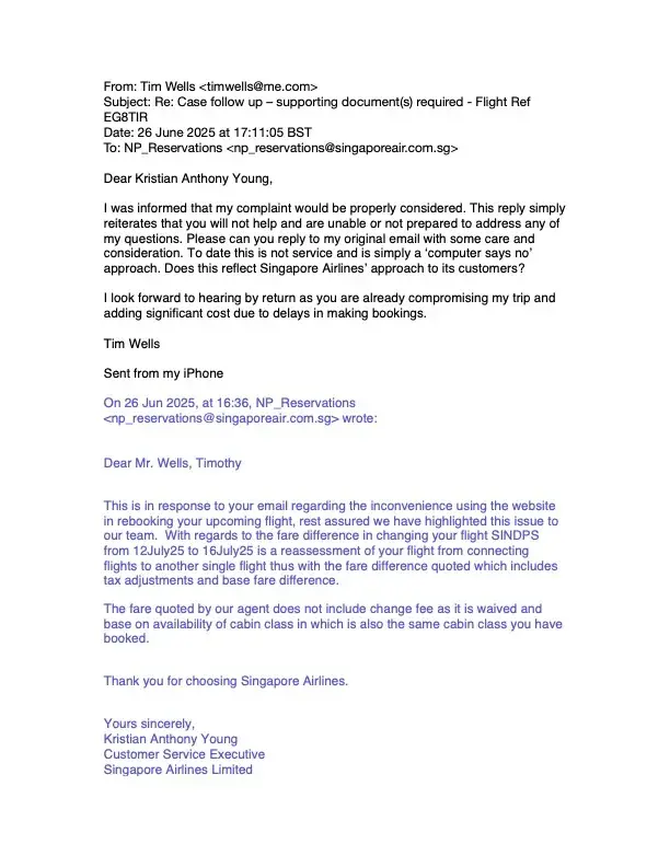 I am deeply concerned about the service of Singapore Airlines and astonished by the outcome so far. Being a passenger I would greatly regret to travel to Singapore Airlines and that may apply in the future. However, I would greatly appreciate if you escalate the issue and resolve those issues as I have very much upset the way it has been handled by the airline.