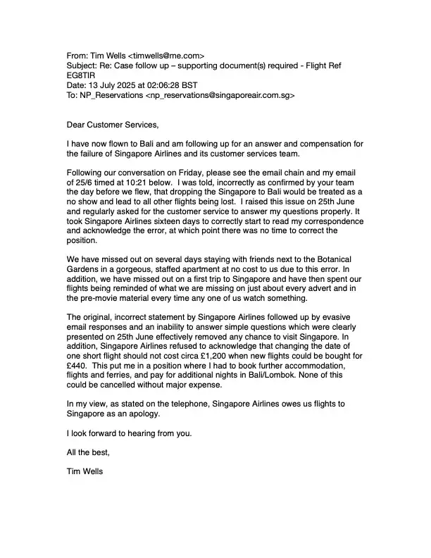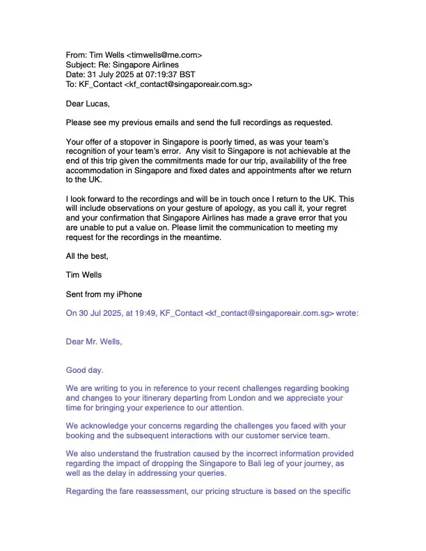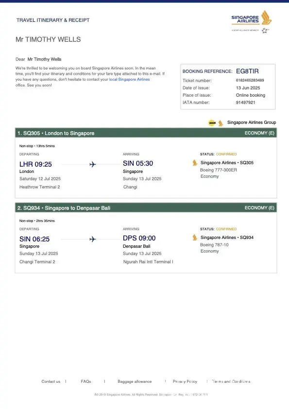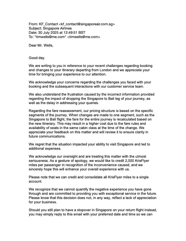 13th June 2025 I bought four return flights from London to Bali via Singapore (Economy Flexi to Bali, cost £5,782 attached). 24th June 2025 I called Singapore Airlines to discuss stopping over in Singapore. Singapore Airlines stated that I had to change the entire flight from London to Bali at a cost of c£1,200. I said no and then asked if I could simply...