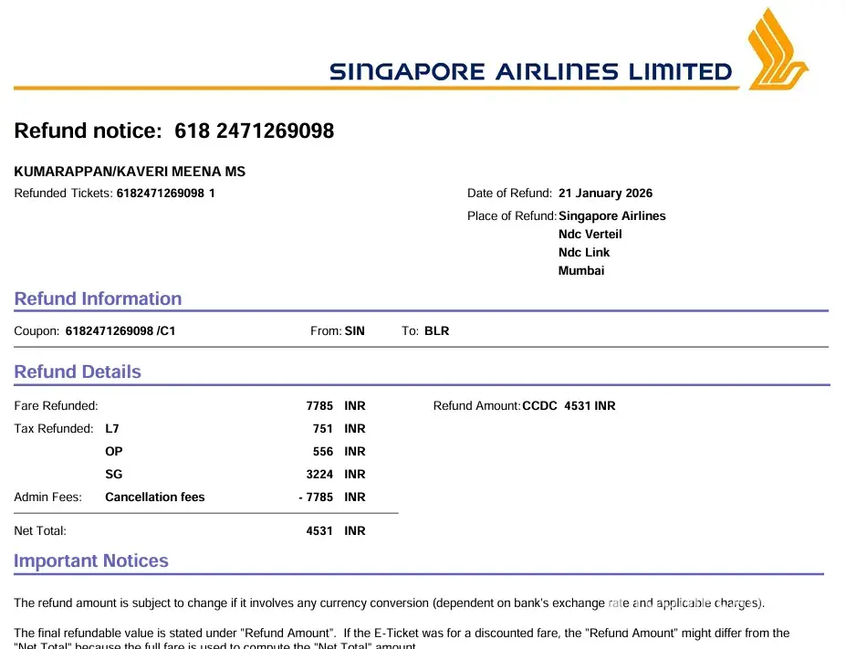 Subject: Reimbursement from Singapore Airlines