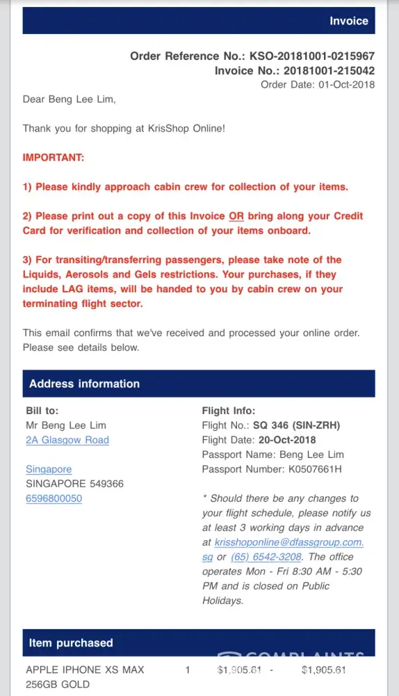 I bought aproduct KSO :[protected]-230242 on 5/12/2018 using Krisflyer points earned. I had paid shipping fees during the purchase. Unfortunately i was told to fork out another 549.10 rinngit when i recieved the product. This appears to be like a SCAM. i AM VERY DISAPPOINTED WITH THIS PURCHASE. Firstly there are so many hidden costs not mentioned. Secondly the product was sent very late after many emails liasing with your officer. Thirdly, I was in the midst with Nafisa, one of your kind officer to arrange the product to be returned to Singapore. The product was just dumped in my husband's place. I have been a faithful and frequent customer of Singapore Airline. This is my first purchase with KrisShop on line. I find this service very very disappointed. This is not justifiable. I would like an official explanation. I received an expensive and horrible gift from Singapore airline as my Christmas Present