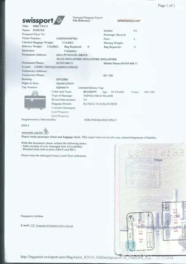 1) We were departing from Singapore Changi Airport to Perth on Tuesday, 20 Nov 2108 on Flight SQ213. Upon arrival at Perth Airport and claimed our baggage, my baggage number lock was damaged. It could not be locked and totally usable at all.