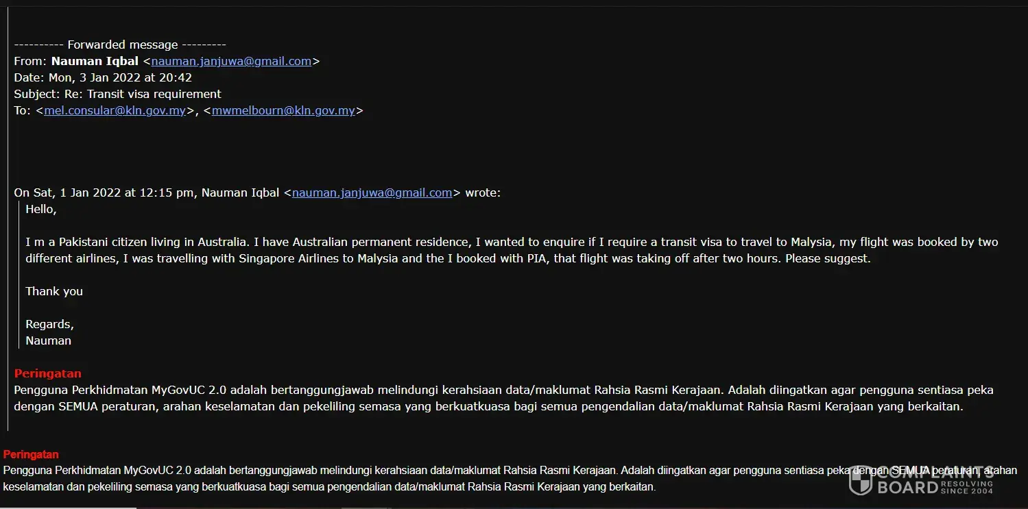 I was traveling from Melbourne to Karachi, Pakistan (i.e my home city) and I had booked a ticket with two Airlines, I was flying with Singapore Airline on the 22nd of December 2021 and was arriving in Kaula Lumpur airport on 23rd December 2021 at 10:20 am, I had booked the next flight with Pakistan International Airline from Kaula Lumpur to Karachi that was departing at 1:00 pm the same day from the same terminal(i.e just after 2 hours 40 minutes after my landing in Malaysia). Singapore Airlines rejected to board me on the flight, when I had all the documents with me including my PCR test and Covid vaccination certificate, also I had my airline ticket with me with the second airline as proof that I would not be staying in Malaysia. I was shifted from one counter to another without being addressed. All I was told was I m being rejected to board on the flight since I don't have a valid visa to Malaysia.