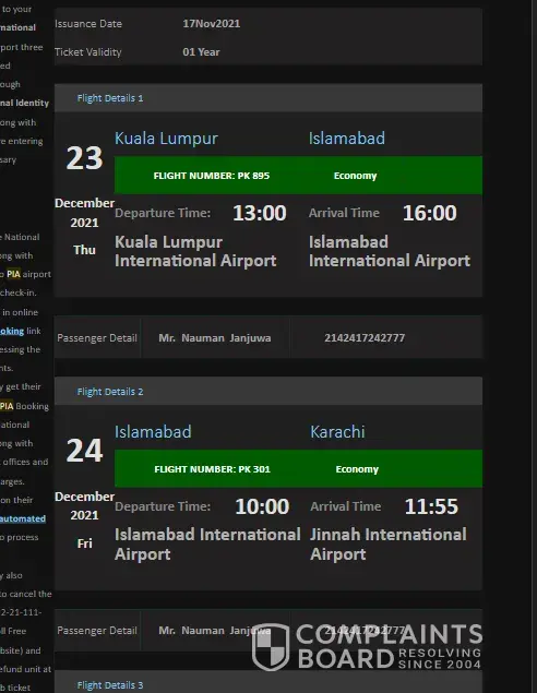 Desired outcome: A) Refund of the tickets that I paid for, from:1) Melbourne to Kaula Lampur: $8952) Melbourne to Karachi with Emirates: $3034B) Compensation: $10,000