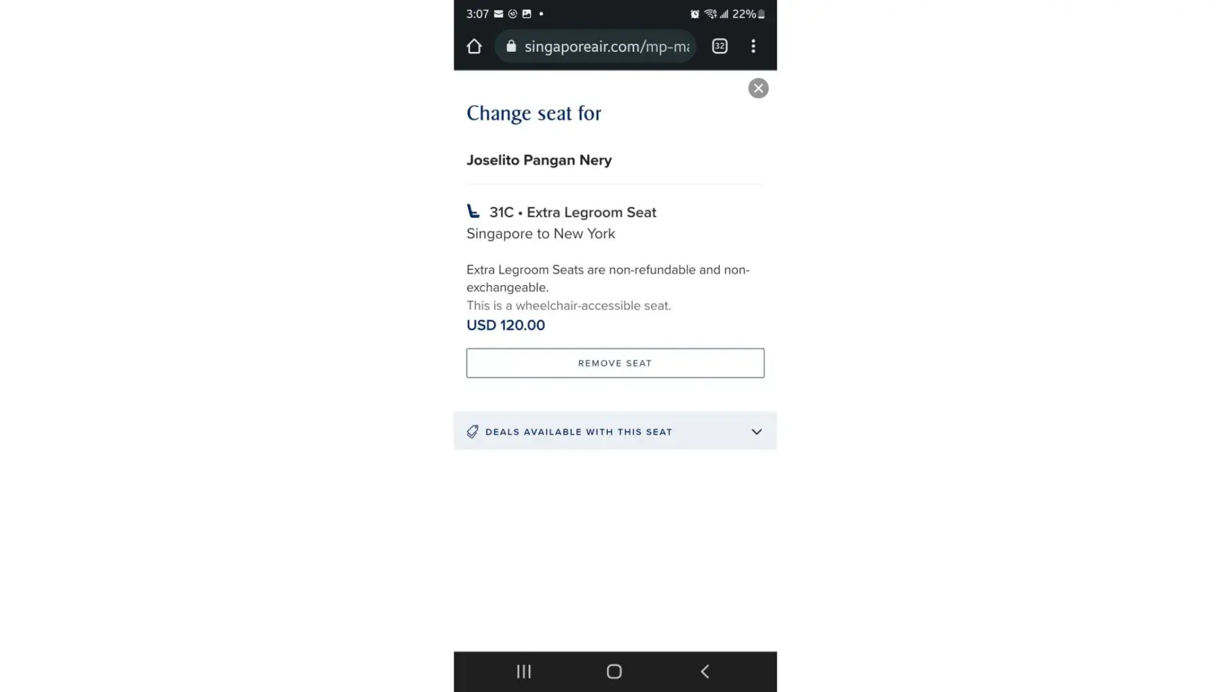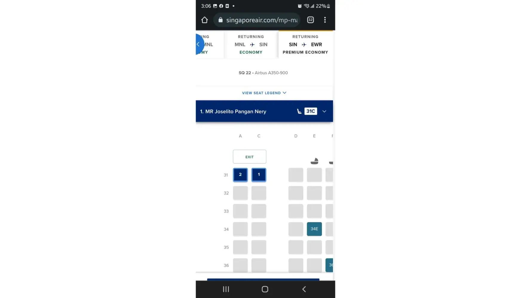My husband and I, purchased on March 4, 2022 a roundtrip ticket from EWR Newark NJ USA to NAIA Manila Philippines for our trip from May 14 , 2022 to June 4, 2022. OUR BOOKING REFERENCE IS 5FB75L and we purchased 2 extended legroom seateach on flight SQ021 (EWR-Changi) with seat number 31A & 31C, flight SQ918(Changi-NAIA) with seat number 55B & 55C, and flight SQ022 (Changi-EWR) with seat number 31A & 31C. I requested for wheelchair assistance online. Someone from Singapore Airline called me and granted my request for wheelchair. After that request, I found out that i no longer have all my 3 paid extended legrooms seats besides my husband. It showing that i have no seat assignment which is absurd as I paid for that 3 extended legroom seat. So i again contacted Singapore airline online to find out what happened to my paid seats. After a few days, someone from Singapore airline called me. she told me that i lost my 3 extended legroom seats because i requested for a wheelchair. My extended legroom seat was meant for abled bodied person only. I told her that the first S. Airline customer representative never informed me about this that day I requested for wheelchair. i told him to give me back my seats back and she told me she cannot do it unless i canceled my wheelchair request. So i have no option and was forced to cancel my wheelchair request to get back all my 3 extended legroom that i paid for.So after that conversation, i was able to get back all my 3 paid extended legroom seats back again. Yesterday April 26, 2022, i got a call from SHAIK FARSAL after replying to his email with regards to my extended legroom seats. i told him I already got back all said 3 seats. He checked on my flight details and he told me that i have no seat assignment on my flight SQ021 EWR-Changi. So i check on my side and to my surprised, my 31C extended legroom seat was no longer under my name and that I now have no seat assigned. I ask him what happened? He told me that because i requested for a wheelchair the first time. i told him i already canceled my wheelchair request and all my paid extended legroom seat was reinstated back to me. He again insisted of the wheelchair request that i made. I told him if that's the case, how come my other 2 extended legroom seats are still under my name. He told me he cannot give me back my seat as it was already been purchased by another passenger. SO YOU WERE ABLE TO REMOVE ME FROM MY SEAT THAT I PAID FOR TWICE AND YET YOU CANNOT REMOVE THE PERSON WHO jJUST RECENTLY BOUGHT MY SEAT THAT I APID FOR ON MARCH 4, 2022? I WANT MY SEAT BACK AND IT'S NOT MY PROBLEM IF SOMEBODY BOUGHT IT ALREADY. YOU NEED TO REMOVE THAT PERSON FROM MY SEAT THAT I PAID FOR. HE INSISTED HE CANT DO THAT. SO I TOLD HIM YOU ARE DISCRIMINATING ON ME. MR SHAIK FARZAL UPON HEARING THAT YOU ARE DISCRIMINATING ON ME, SUDDENLY HANG-UP ON ME. UPON CHECKING AND SCRUTINIZING MY FLIGHT SEAT DETAILS, I FOUND OUT THAT MY 3 PAID EXTENDED LEGROOM SEATS WERE ALL WHEELCHAIR ACCESSIBLE SEATS. SO WHY REMOVED ALL THOSE 3 SEATS AFTER I REQUESTED FOR A WHEELCHAIR ASSISTANCE? AND AFTER I GOT BACK MY 3 PAID EXTENDED LEGROOM SEATS, WHY DID SINGAPORE AIRLINE REMOVE AGAIN AND THEN SOLD MY SEAT 31C TO ANOTHER PASSENGER FOR THE REASON THAT I REQUESTED A WHEELCHAIR WHEN I CANCELED IT ALREADY. THAT'S OUTRAGEOUS AND AN ACT OF DISCRIMINATION ON MY DISABILITY. SAID 3 EXTENDED LEGROOM SEATS 31C, 55C & 31C ARE ALL WHEELCHAIR ACCESSIBLE SEATS. SINGAPORE AIRLINE CLEARLY VIOLATED AIR CARRIER ACCESS ACT (ACAA).