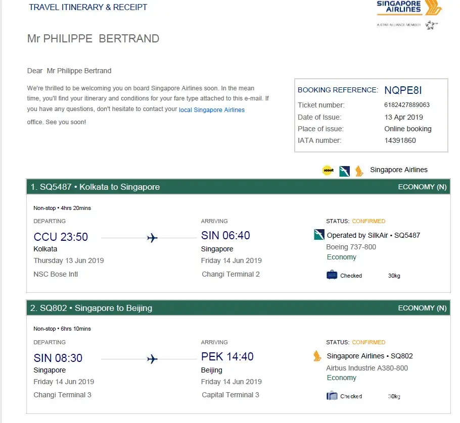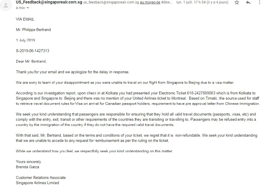 Now, I contacted several times Singapore Airlines, and they came back to me with false statement that I didn't have my boarding pass of my flight from Beijing to Montreal with United Airlines, once I tried to proceed the check-in in Kolkata Airport on June 13th 2019. This is false as I had a photocopy of my receipt and I also had my booking (dated of April 13th) on my cellphone, so I could easily give them a photocopy of my flight from Beijing. I just think they didn't investigate very hard on that matter and this is why I'm going through a different solution now.