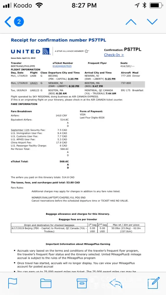 - Flight with United Airlines from Beijing to Montreal (bought on April 13th)