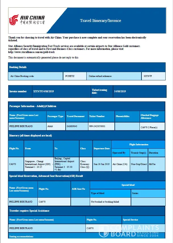 - Flight with Air China from Singapore to Beijing (bought on June 14th)