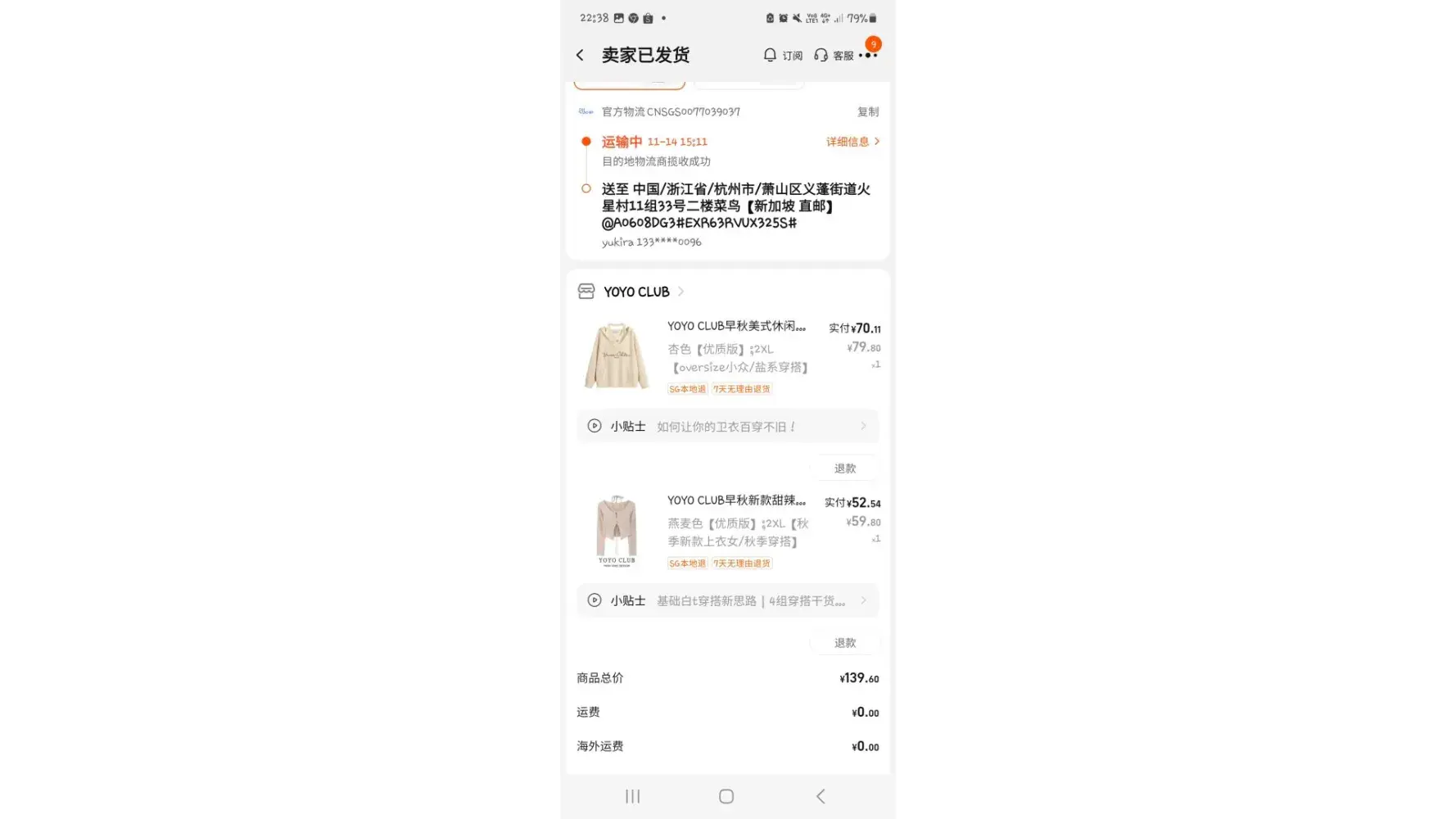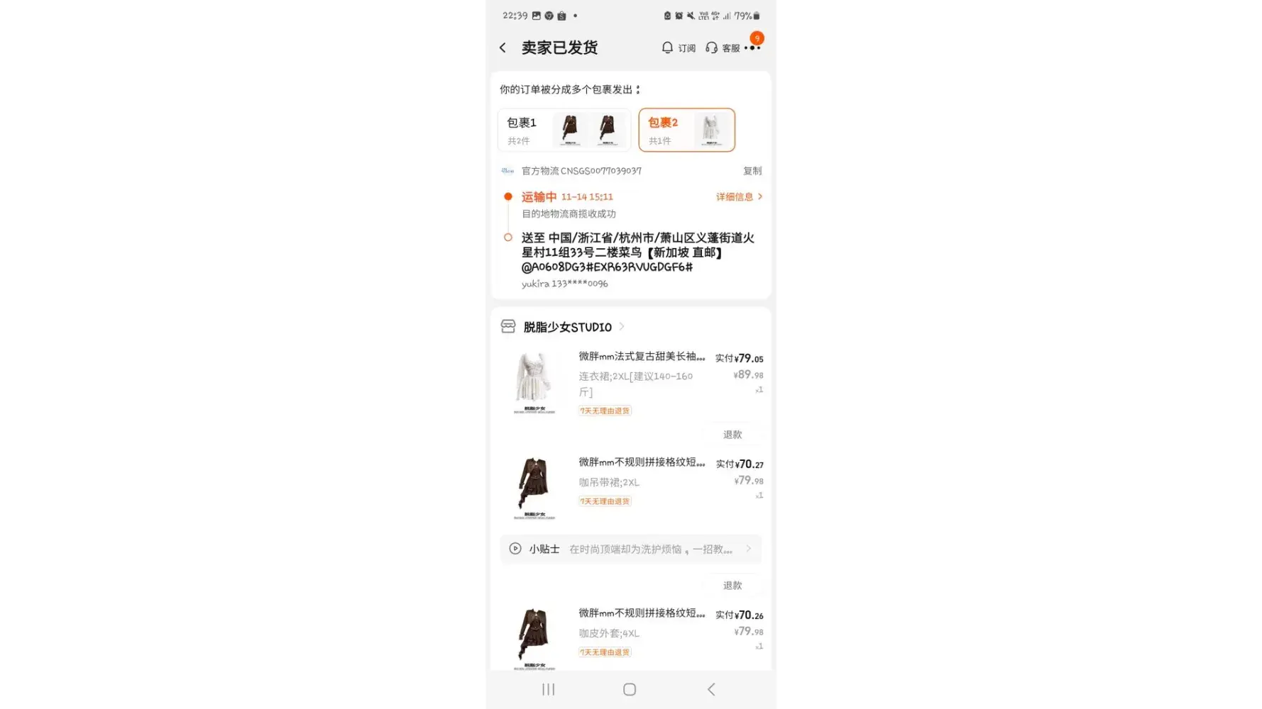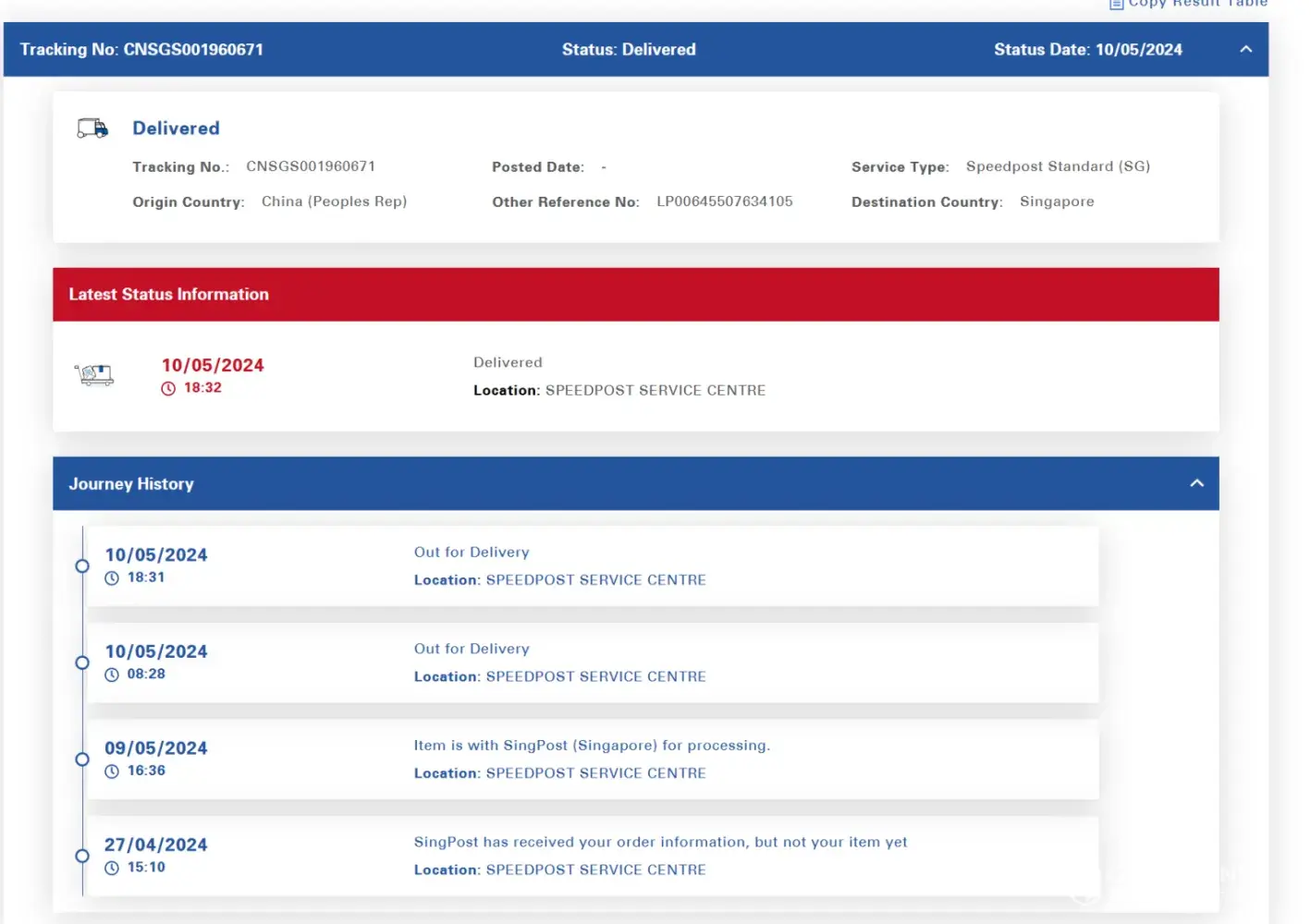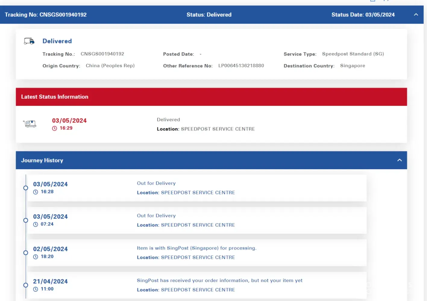3. SingPost Parcel number: CNSGS0098390802
