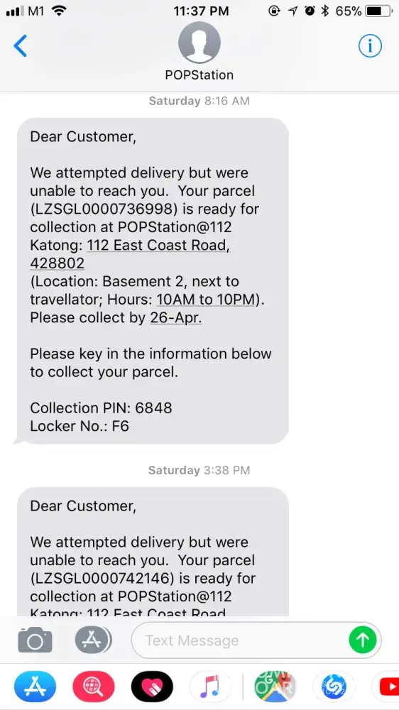 Hello, I had received singposts notifications on a Saturday (21 April 2018) that my parcel will be arriving. As such, I have stayed home to await the arrival. However, to my utter dismay, i received 4 unsuccessful delivery notifications during the day whilst sitting at home without the phone buzzer ringing (see attached). Adding to the disappointment, it is to my horror that when my husband went to pick up the items from the pop locker today (24 April 2018), the parcels were considerably large (see attached image) and he had to hoist the items all the way home.