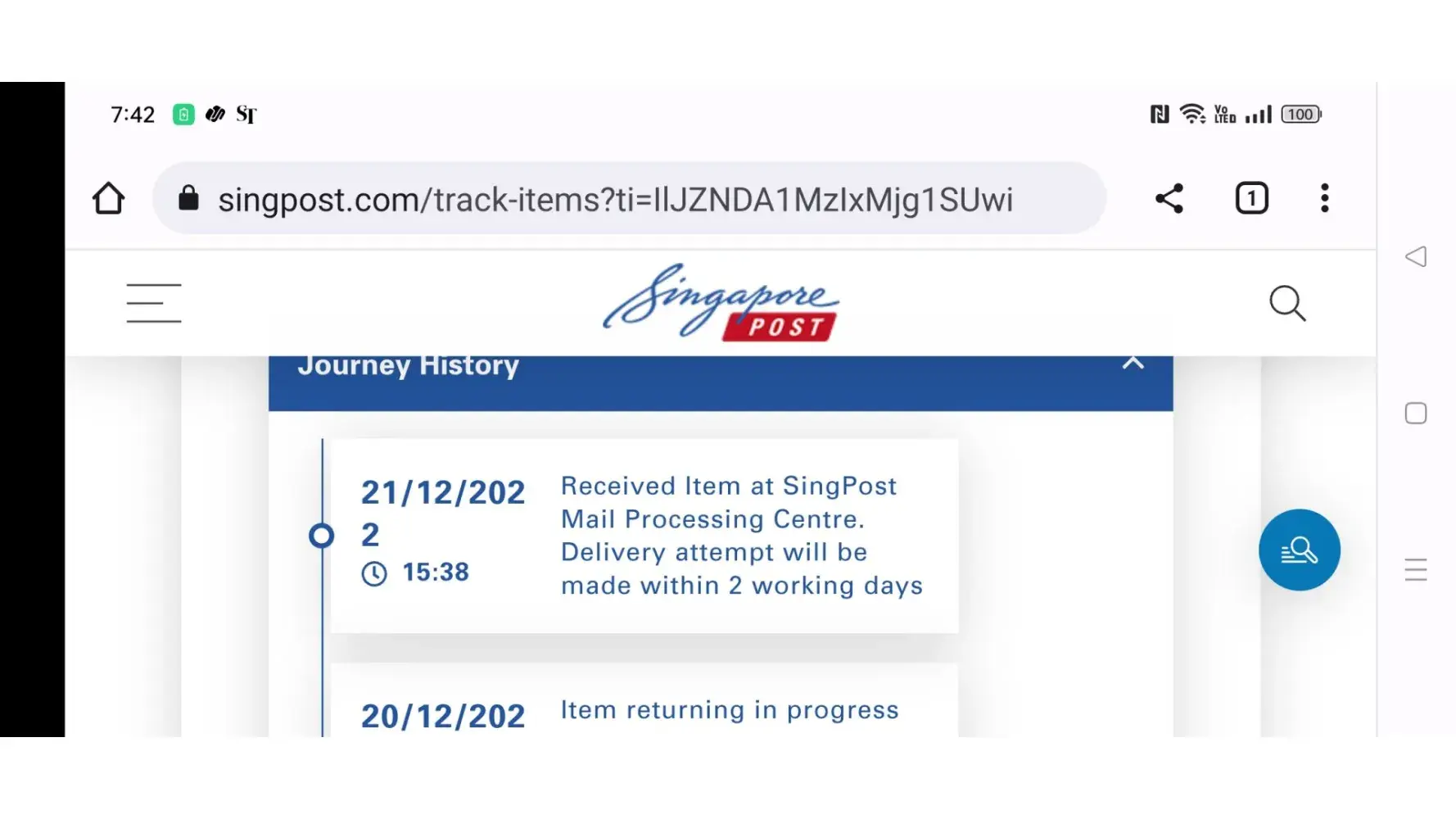 The next day morning (21 Dec 2022), without any delay, I immediately called Singpost to check the status and request for the item to be collected at the nearest Singpost branch (we agree Sengkang branch) and the lady answering the call told me she will do so and item still in Singapore and she told me someone from Singpost will call me to confirm the arrangement.
