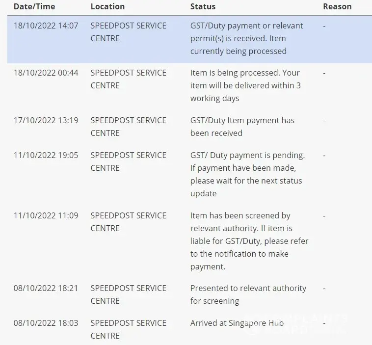 when I received the GST letter it was on 17 Oct 22 and our finance immediately make payment on the day I received. Usually the next day I will receive as it was a speed post. on Tuesday I never receive the cargo. So I wait untill Thursday I call speed post hotline. they told me within 3days after GST payment was make will deliver to us. than I wait till Friday. its 3rd day. I waited whole day no parcel came. I call again. they give alot excuse like already proceed. and say maybe another week after Depavali 25 Oct 22. I was so angry. I had cancel my appointment my leave just to go office and waited for the Cargo and their replied is, they will try their best and ask if can delivered on another week. I find the process is dam so slow. shouldn't call speed post . should call slow post. The cargo status has Arrive SG on 08 Oct 22. only 17 Oct 22 I than received the GST payment. Took 1 week plus than I received the invoice. and this is not the first time. I can say it's really dam lousy service. I guess now customer is not import to them. If important, I have feedback so many times but no improvement. So disappointed