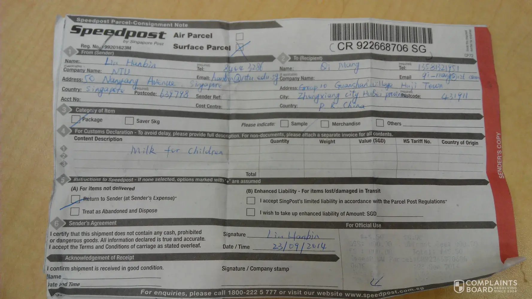 I sent some child milk to china on 23 Sep 2014, but it did not arrive until now. 57 business days (10 weeks) has passed away! Actually, the longest delivery time should less than 50 business days for a slowest post item. Furthermore, I cannot track any information about the post item. I complain twice, but they reply nothing until now.