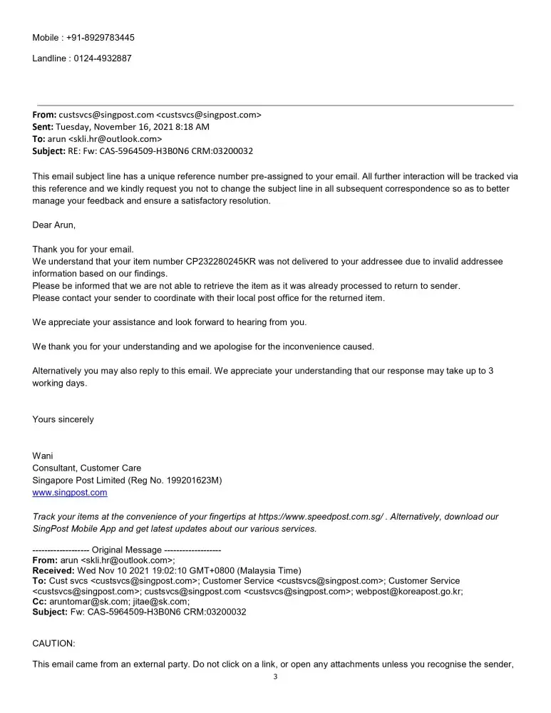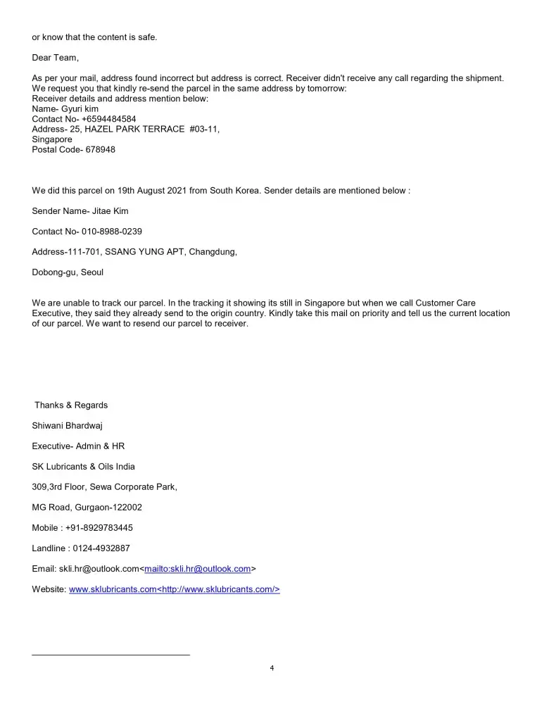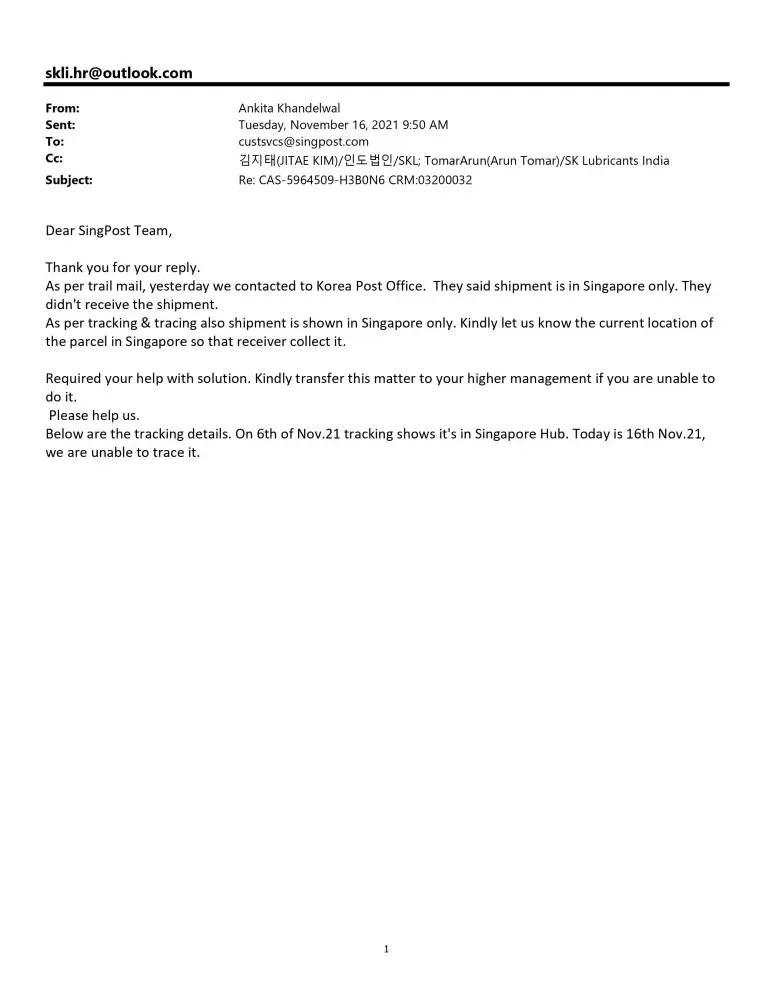 This is to inform you that we send one parcel to Singapore on 19th Aug.2021 from South Korea but receiver didn't receive the call for the shipment. Once we called Singapore Post for the details they said address was wrong. Singapore post receive the shipment on 15th oct21 but they didn't call to receiver for shipment. We contacted them from 8th Nov.21 via call or mail but did not get the satisfactorily reply. SingPost said that courier sent back to Korea but in the tracking details its shown in Singapore Only. Please help us to deliver the parcel on below mentioned details as it is very important parcel for the receiver. Receiver details are mentioned below: