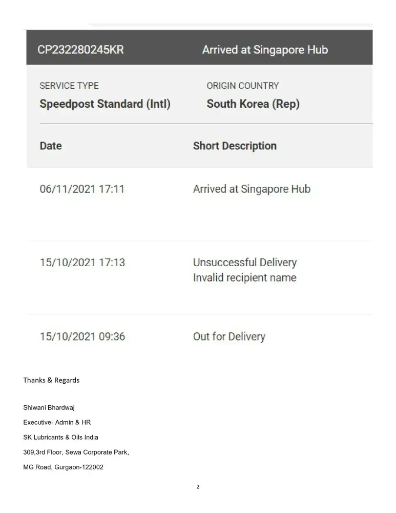 However till today (11/12/2021), no delivery by SpeedPost.