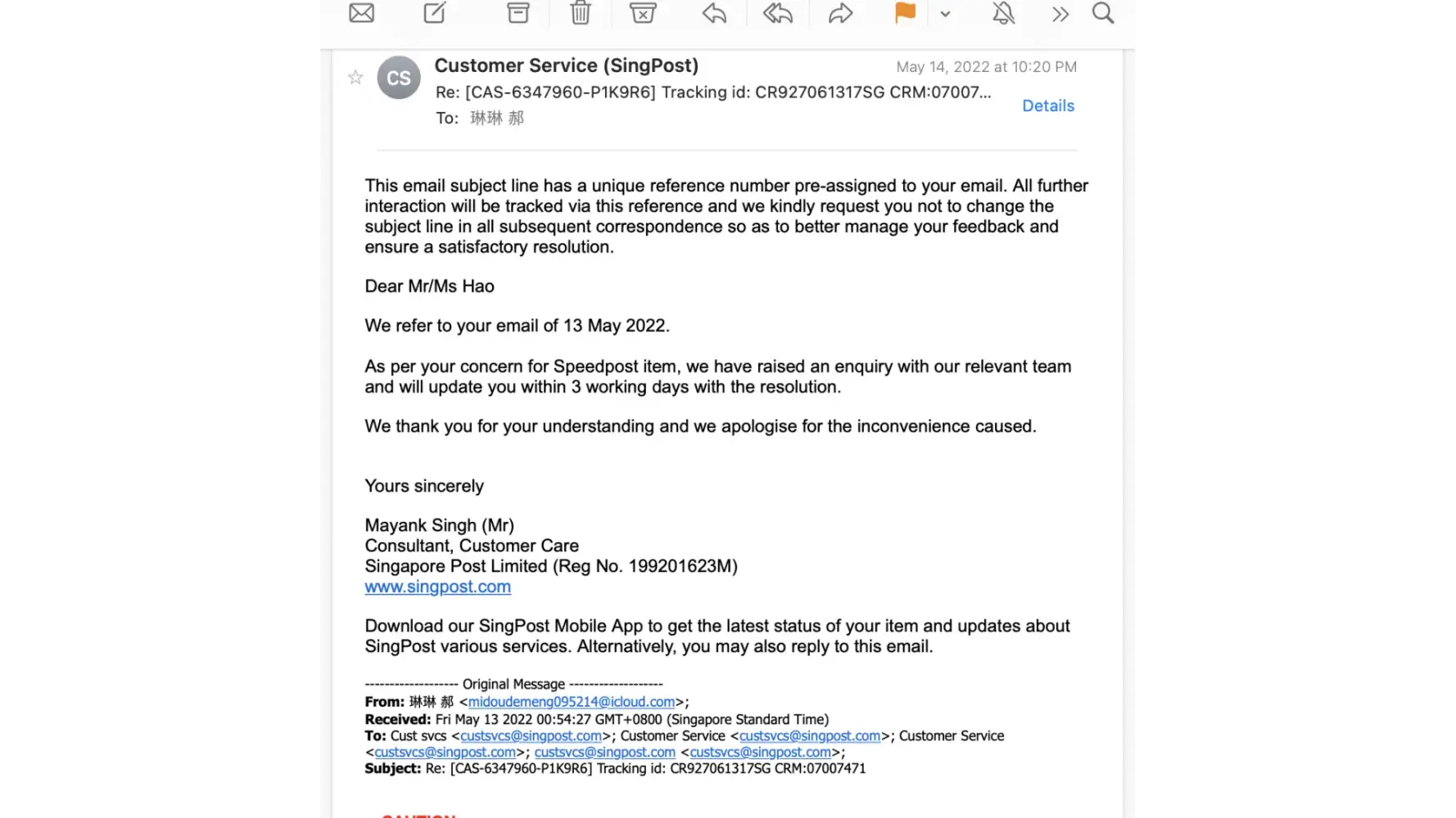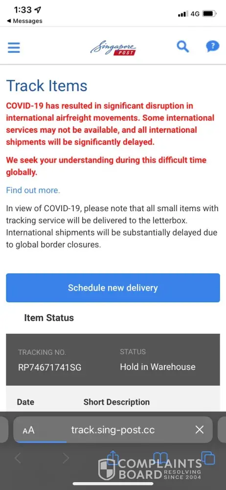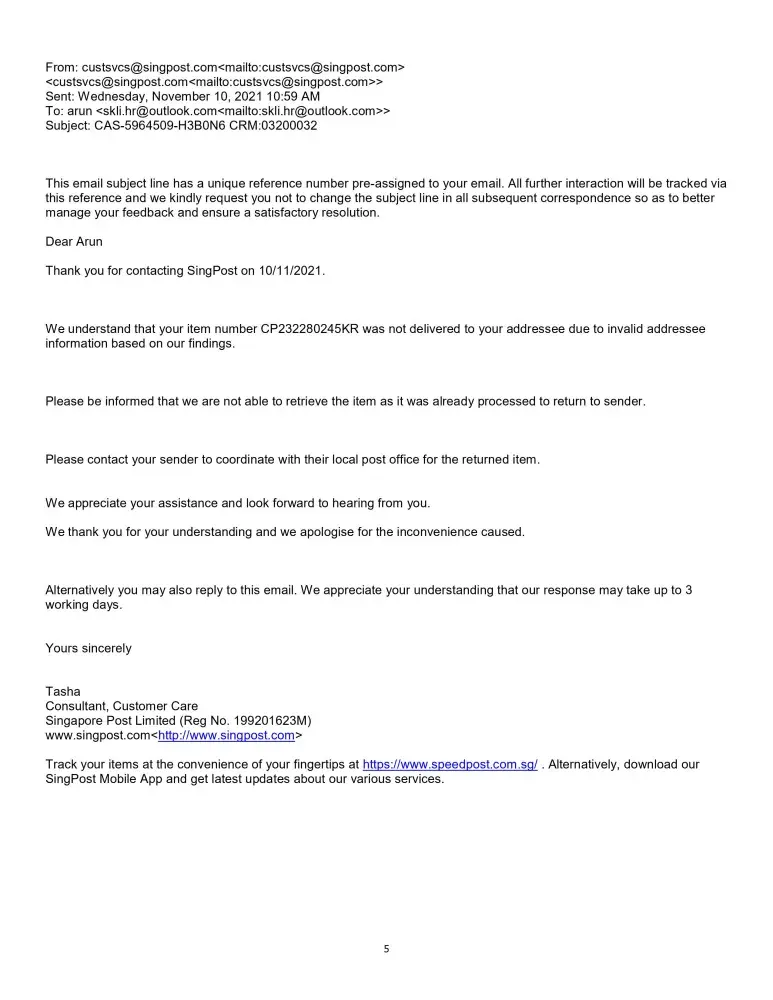 Singapore Post (SingPost) has left an official reply on this complaint.
