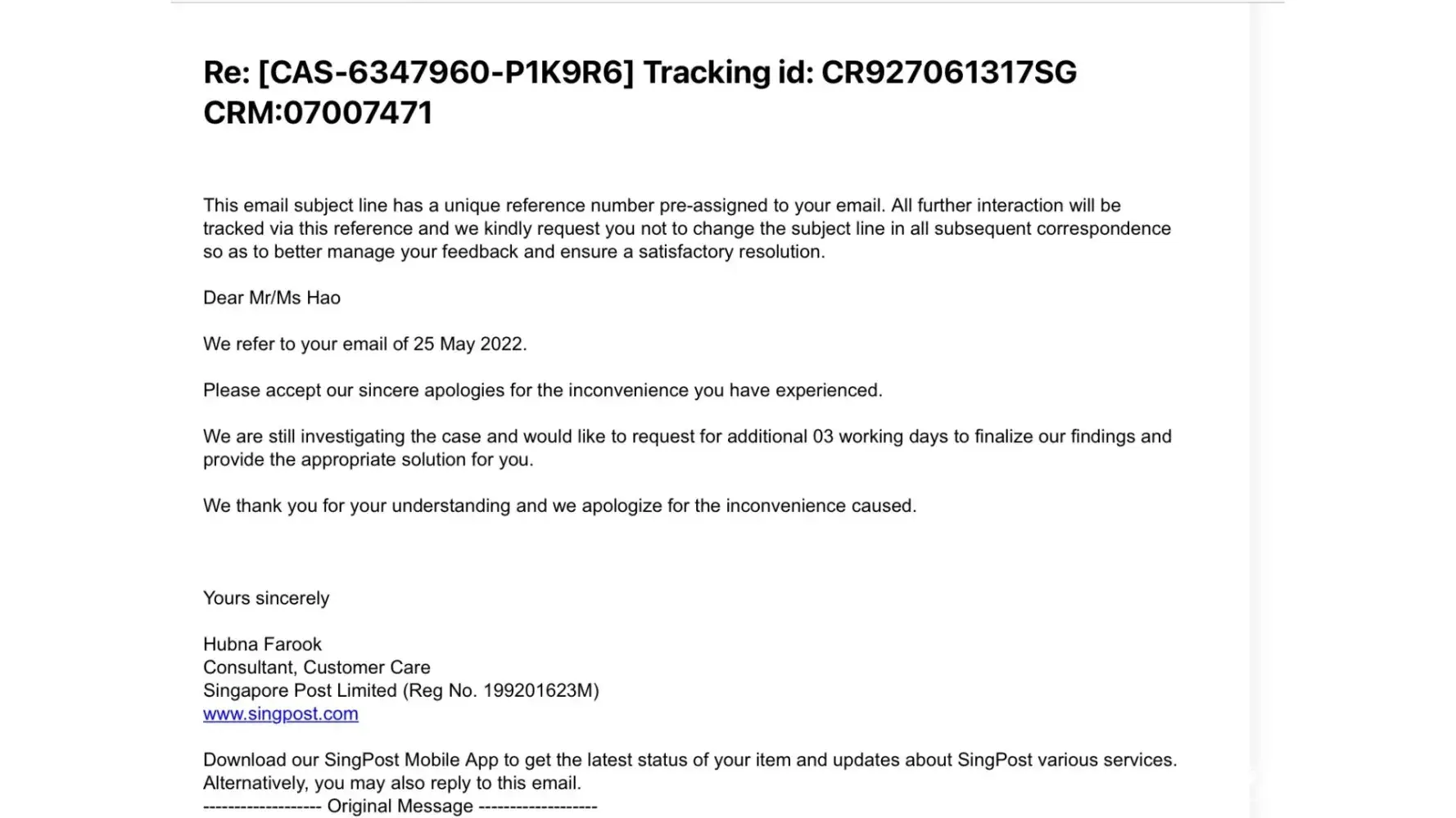 Did SingPost take the time to read the complaint? Is my name anywhere in this long post? I posted the case number for reference. Not for SingPost to look it up and disregard my rights of privacy by posting information I have not provided in the complaint. Or is it simply because you do not wish to reiterate that I am Irate?