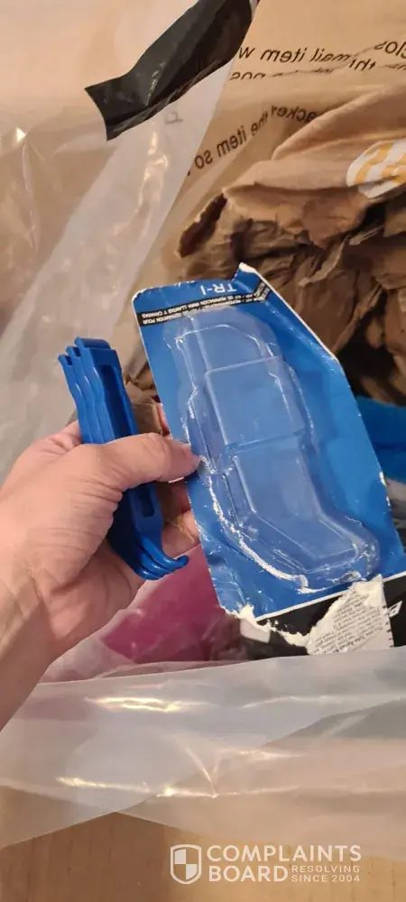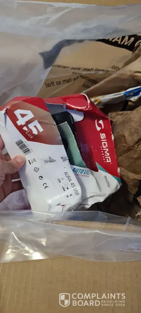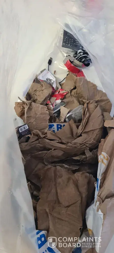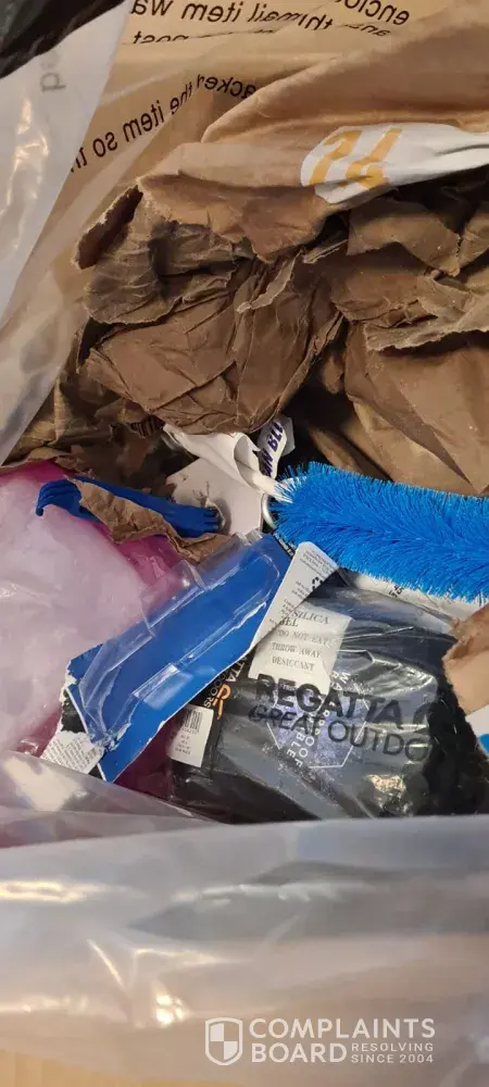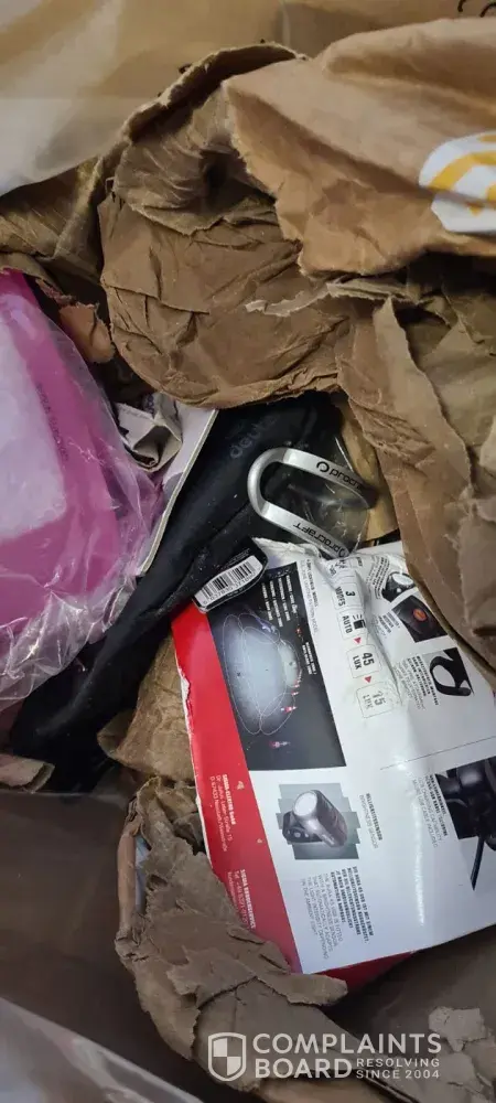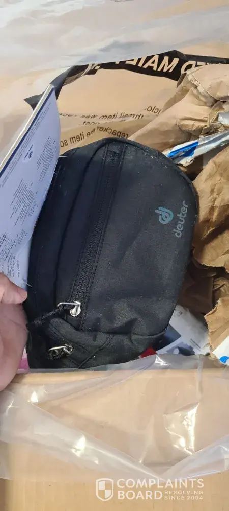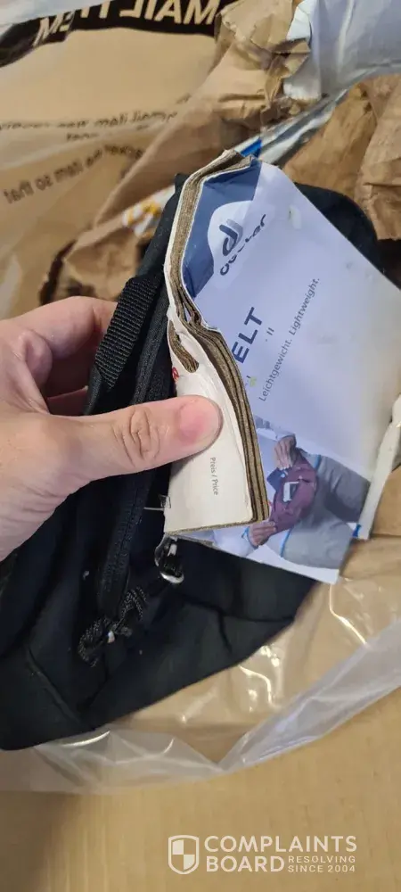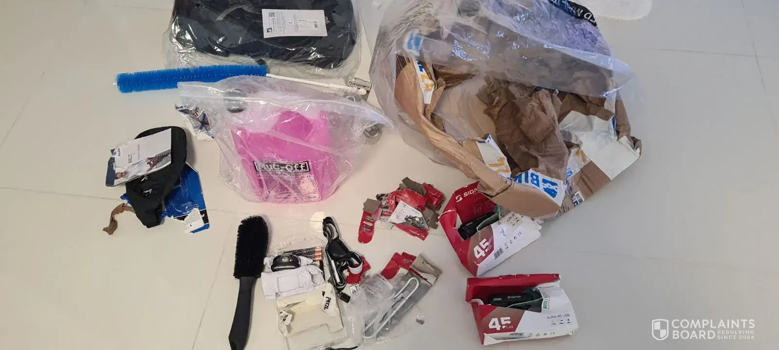 I had 13 items inside, and all of them are wet, smelly, and the packaging, manuals, fell apart at touch! it was obvious that the whole package was left in the rain or have at least spent a long time in wet conditions for it to be in such a sorry state. I had a mix of items, the soft goods(bags) were thankfully not torn, but stank even after i have washed them, which i had to, as the paper and packaging from the other contents had became pulp and stuck to the bags. The electronics, some of them could not be powered up, and those that could, i dread to think that they have been contaminated internally and it will be a matter of time before it will stop working.