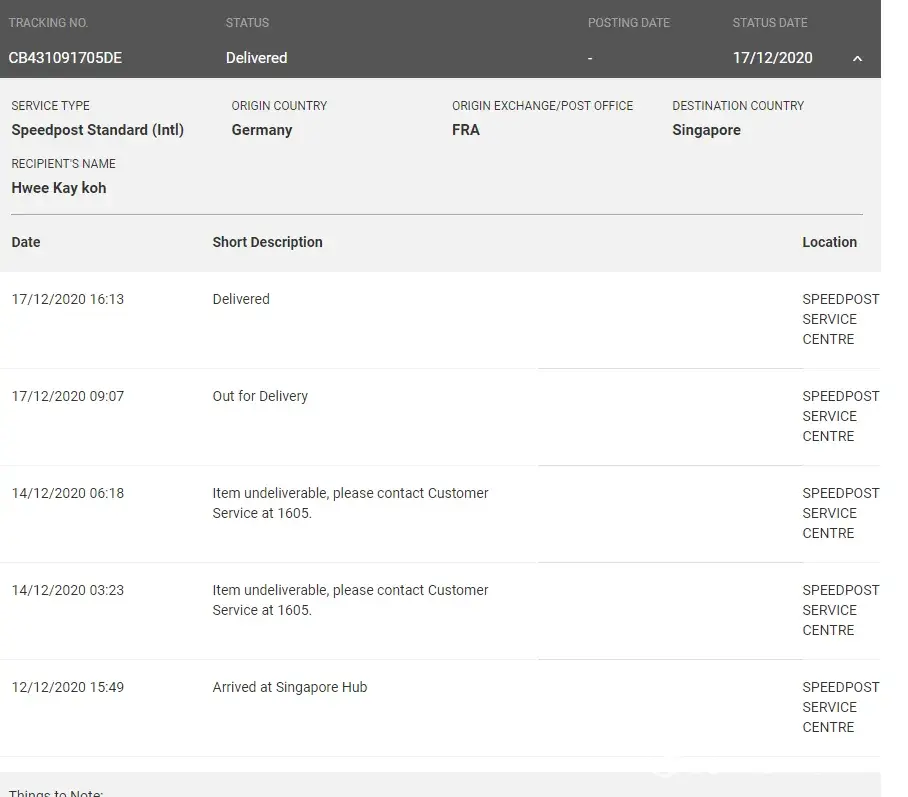 On 16/1/2021, while I collect my parcel at post office, I was told to check with speedpost as it was not delivered to post office.