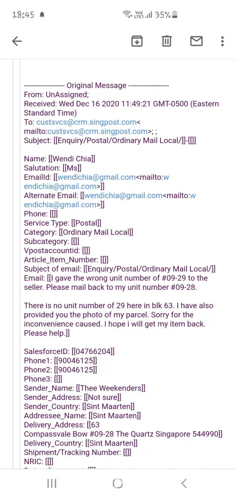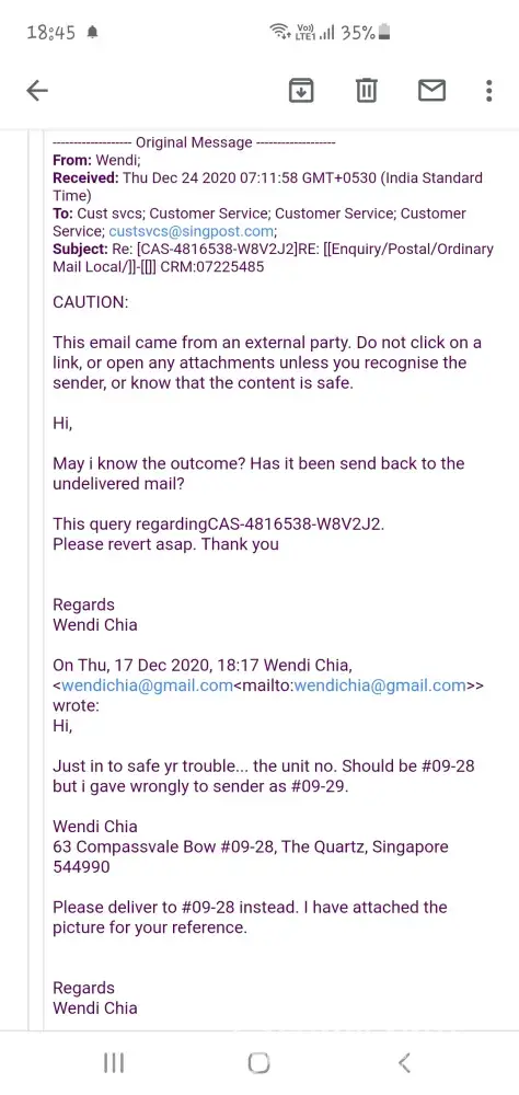 On 16 Dec @ 1149hrs, i wrote an email to Singpost to informrd them that my parcel address is wrongly given and also with the image of the parcel provided for them. I fully understand that this is just a normal mail postage and i won't be able to trace it. Hoping by providing the image and email to them i can retrieve my parcel.