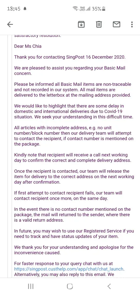 I tried contacting Singpost multiple times to get any kind of update, such as where are all these parcels stored (are they still in Singapore in a post office or warehouse somewhere?), what are they doing with all these unsent parcels due to the suspension of their international post, as it has been months, yet they do not care to give an appropriate answer. The chat agent even left while I was enquiring halfway. I have never encountered such irresponsible and nonchalant customer service where the staff just ends the conversation when you're still typing and asking a question!