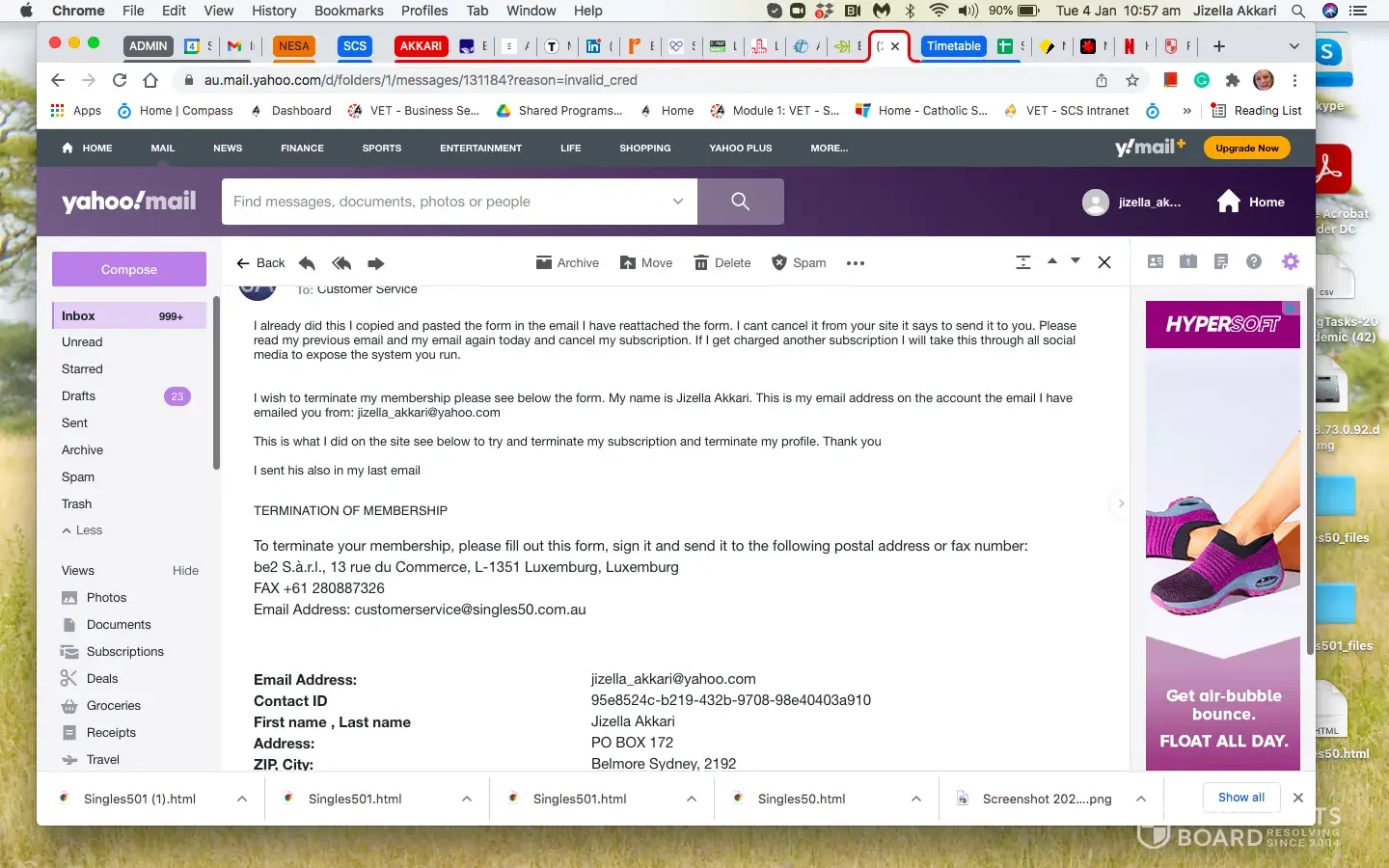 Contacted company via email [protected]@singles50.com.au on 15th July 2022, to cancel the account in the name of Carolyn McAleese. Received a reply email Ticket#[protected] from their Customer service team Luxembourg, Commercial Register: B123206, Managing Director: Laetitia Pateau. Email stated “One of their colleagues will be in touch soon”. Have not received any communication from this company and a debit amount of AU $239.85 has been charged to the above named account on 13th October, 2022.