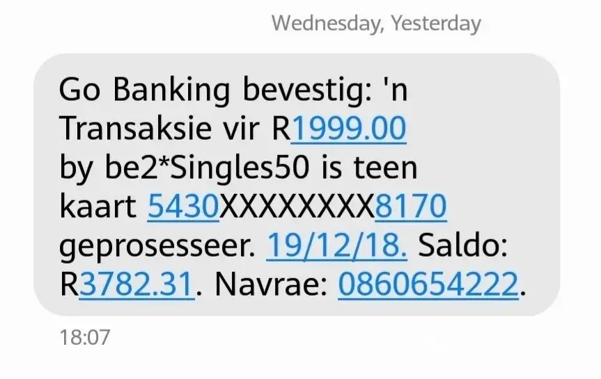 This morning at 3am I received an sms from my bank informing me that R1 999 was taken off my credit card by Singles50.