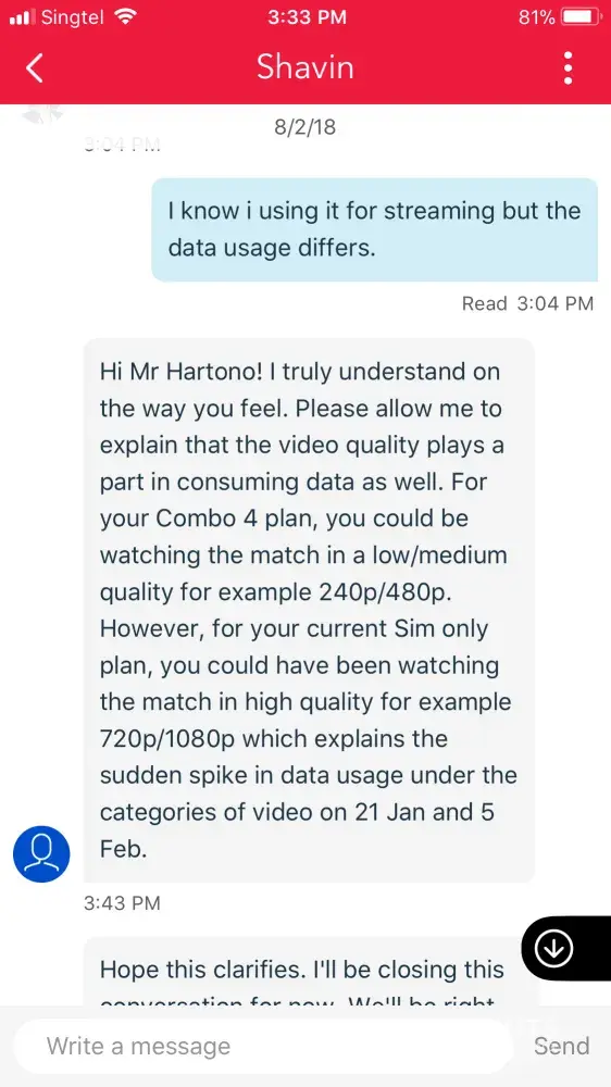 Hi, recently i chg mobile plan from combo to sim plan only, the data usage used up very fast especially using the miotv premier league match.While i was under combo plan, i watch the whole match and it uses 1G! Now on sim plan, watched 2nd half of the match and it uses 3G.Singtel explained that the video quality plays a part in consuming data as well. So for my Combo plan, i could be watching the match in a low/medium quality for example 240p/480p. However, for my current Sim only plan, i could have been watching the match in high quality for example 720p/1080p which explains the sudden spike in data usage under the categories of video.Den why is it that i cant have the option to see it in 240/480p with my sim only plan instead?I wld have save my data. Juz becoz im nt in combo plan u guys stream my videos in 720/1080p which i didn't realise and so it uses more data?Dis should hv make known to consumer when they sign up for Sim plan only that when they are watching live streaming they will be charge for 720/1080p streaming which uses more data. So it means while streaming a live soccer video on mio tv app, data usage is used much more when u are on sim plan and lesser on a combo plan? What the Heck! Pls EXPLAIN!