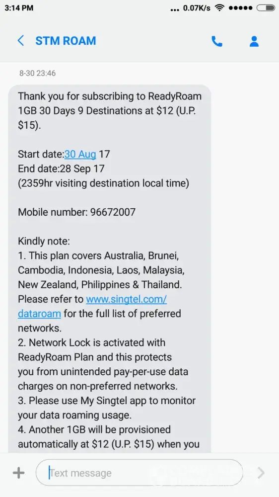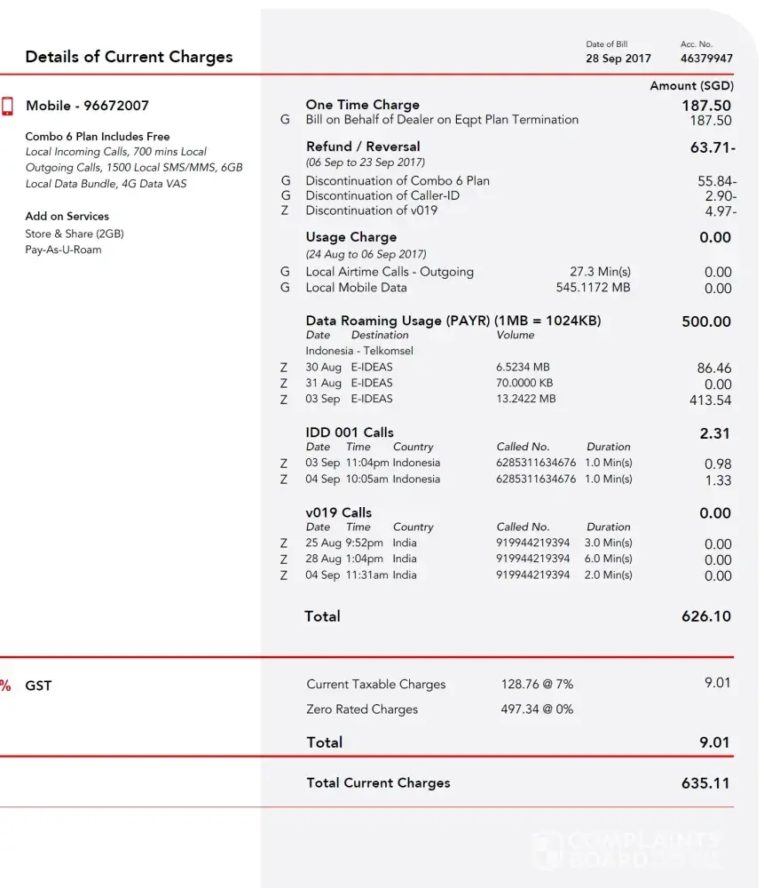 I have activated the roaming plan and received sms ( ref screenshot) but was billed pay per usage $500. Please check and remove it. I also have a $195 deposit amount with Singtel which also not reflected in the final bill calculation but mentioned in the first page.