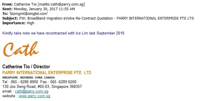 Singtel contacted our company to renew our adsl broadband contract on september 07, 2016. An offer was made to us to recontract and we responded via email with the necessary forms filled in and yet despite having an email confirmation from them on 15th september from their sales staff - ice lim yiao tong [mailto:[protected]@singtel. Bizsales.com. Sg] that they have received my accpetance of recontract (See attached screenshot of email) ; they have chosen to ignore it and keep getting their sales staff to contact us to convert to fibre optic broadband.