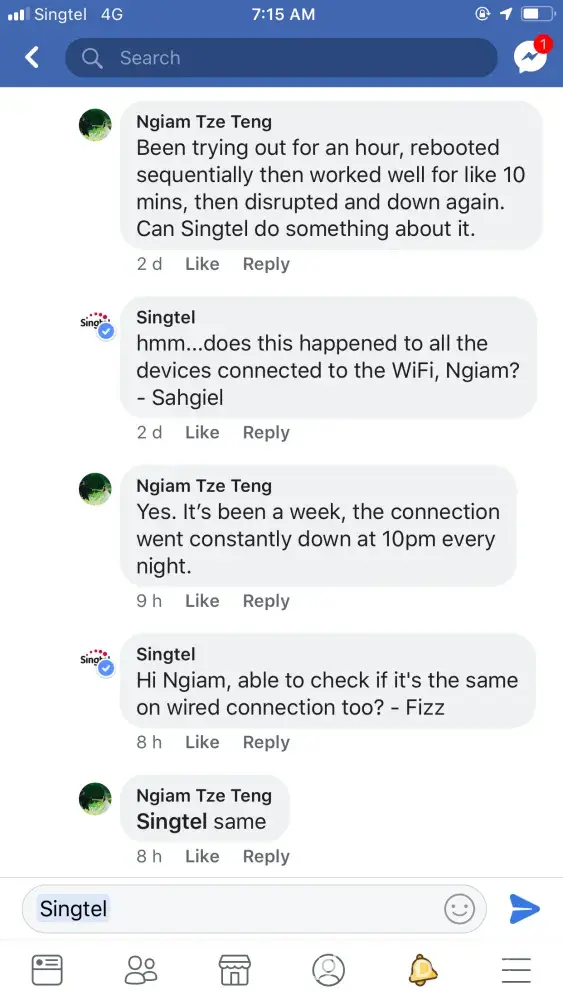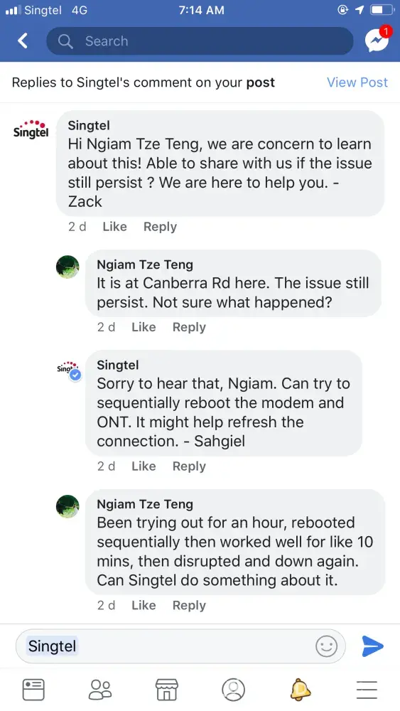 I just wonder if Singtel cannot even fix a small problem like this and needs so many days and so many customer service guys to handle one customer with a small technical fault and still cannot get fixed. I am really worried for the management of Singtel to be frank that the company is no longer the same as before and I wonder how long can Singtel still be there in future.