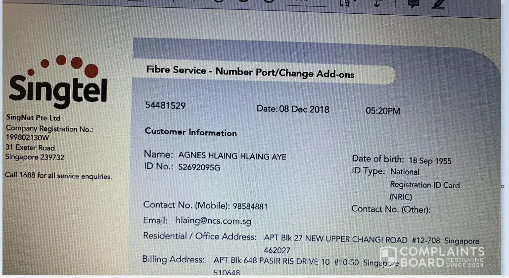 I am surprised of this lapse of control at Singtel. I recalled for any new application or recontract, Singtel will verify the NRIC, and in the case of a foreigner, which extra care would have taken by verifying the passport details and ID and tenancy agreement. However, the fact that the invoice was billed to my address there seems to be a lapsed in control and potential bad debts if the customers goes missing.