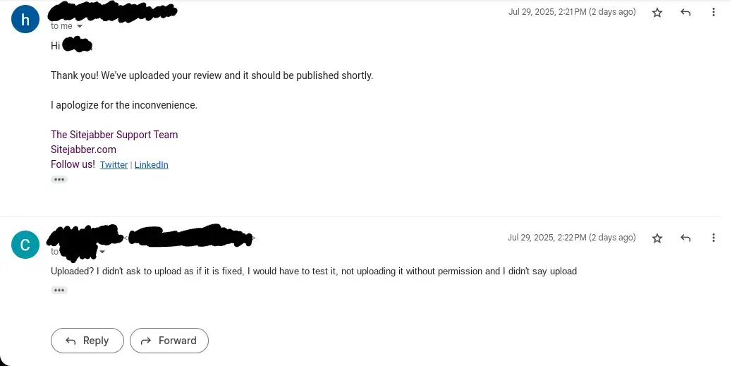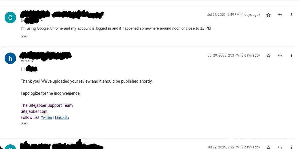 Sitejabber support (Jul 29, 2025 at 2:21 PM (PST)): Hi [my name], Thank you! We've uploaded your review and it should be published shortly. I apologize for the inconvenience.
