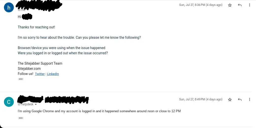 Sitejabber support (Jul 27, 2025 at 8:36 PM (PST)): Hi [my name], Thanks for reaching out! I'm so sorry to hear about the trouble. Can you please let me know the following?
