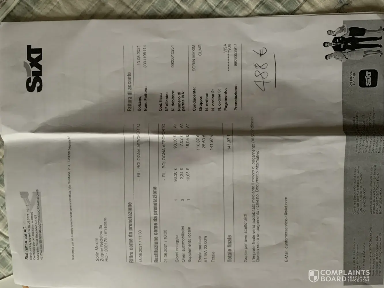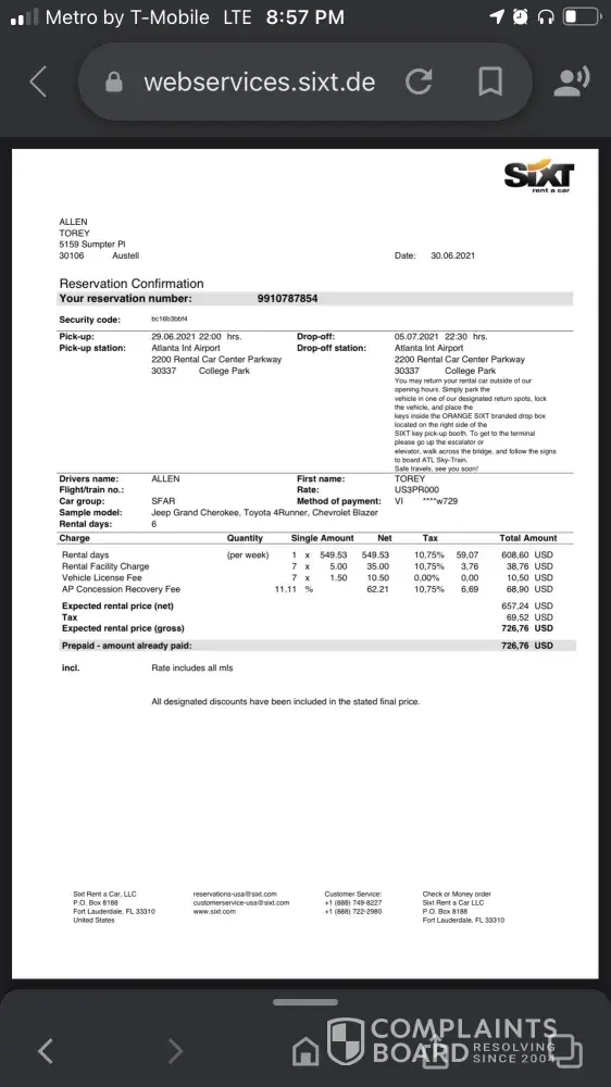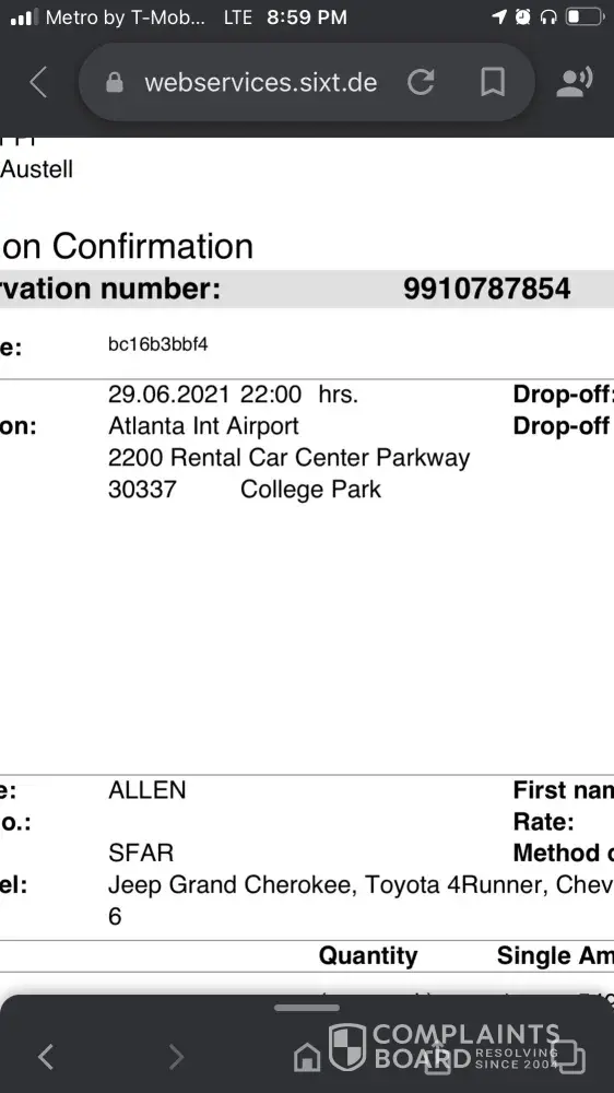 Sixt complain about the reservation number [protected]