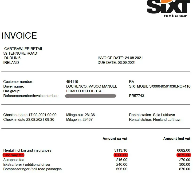 I booked online after simulating one way drive, which was included in the simulation price (Invoice100941) and paid ther car before rent. When I return the car I was charged again for the One way fee NOK1500.
