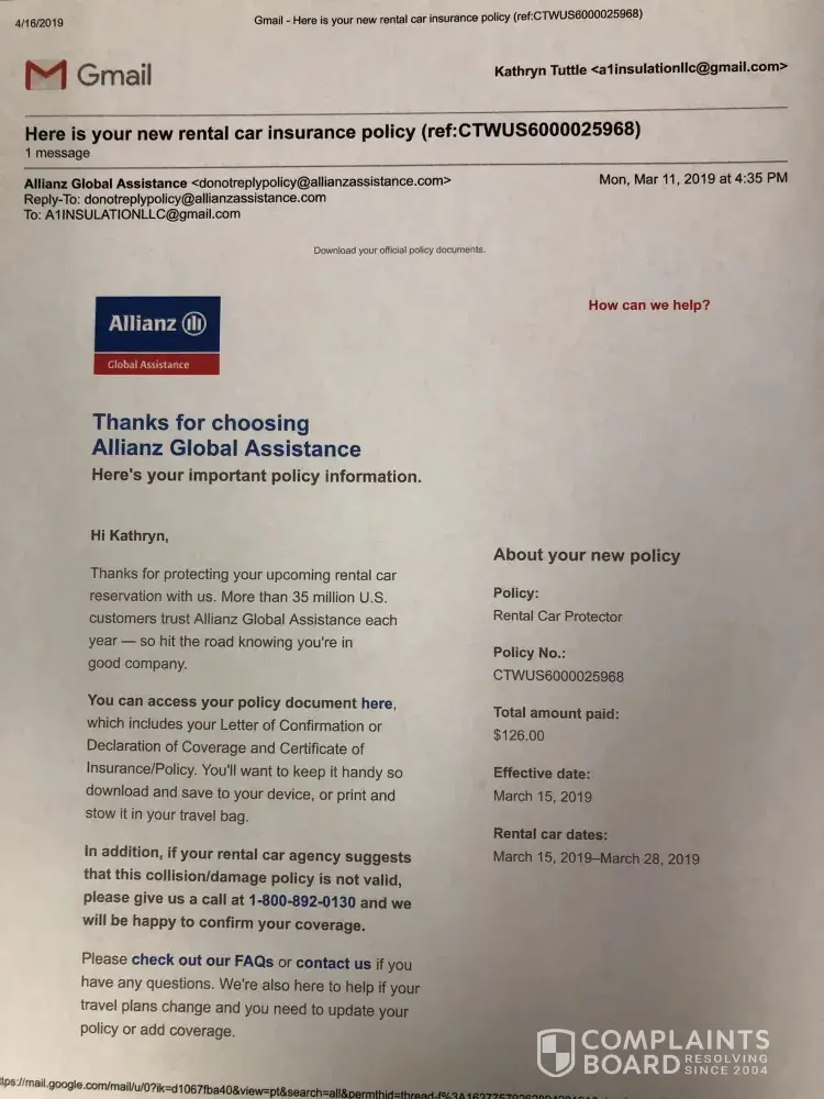 I received my invoice and it states that i authorized premium protection pkg. which I did NOT. I did agree to the prepaid fuel option but I specifically declined not once but twice for the insurance because I have full coverage with State Farm. And I had purchased a separate policy through Allianz (Policy #CTWUS6000025968) just for the down time if anything should have happened. I have tried to explain that possibly a box had been check or initialed wrong. But have just been told nothing will be done about this because I no longer have my original receipt. I believe it was left in the vehicle but I am not sure. I do believe that there are cameras in the rental booths and that this can be verified easily.