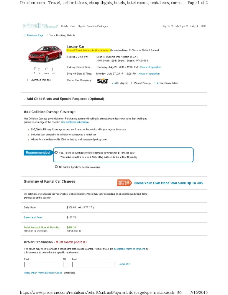 Rented from SixT via Priceline for pickup at Seattle/Tacoma (SeaTac) for a four-day rental. The SixT ad and the email confirmation both state that a guaranteed car model, one of two, will be provided, in my case, a BMW 3 Series or Mercedes C-Class car in their "L" class (Luxury class). Once I arrived to pick up my car, they informed me that not only do they not have one of the car models they "guaranteed", but apparently they had no cars available in that class at all. All they had was an Audi A3, a smaller car from the lesser P-car (premium) category, which I was given with a take-it-or-leave it option and attitude, with no offer of an upgrade to a class above the class of the guaranteed model I reserved (as is customary with most rental car companies when the class of car you reserved is not available) or any offer of compensation. The agent stated in a cavalier manner that this is a common occurrence and that SixT does this all the time. After my trip, I reported this to the Better Business Bureau, asking that SixT stop advertising “guaranteed model” in their ads when they cannot provide a guaranteed model, let alone a car from the same class. They did, only after receiving my complaint from the BBB, adjust my bill to reflect the class of car I was forced to take – and acted like charging me for what I actually received was some sort of compensation. SixT also sent me a voucher for a free upgrade on my next rental – like that will ever happen. Subsequently they sent me a voucher for a whopping - wait for it - $5.00 on my next rental. In my complaint I stated that the money was never the issue, but their bait-and-switch tactics, and their false advertising. SixT stated in their BBB rebuttal that they don’t advertise “guaranteed model” only “guaranteed class”. At this point I upload both the SixT ad from Priceline (which at the time of this review is still actively stating “guaranteed model”), and a copy of my email invoice to the BBB website to supplement my complaint. The Priceline ad states “Luxury Car