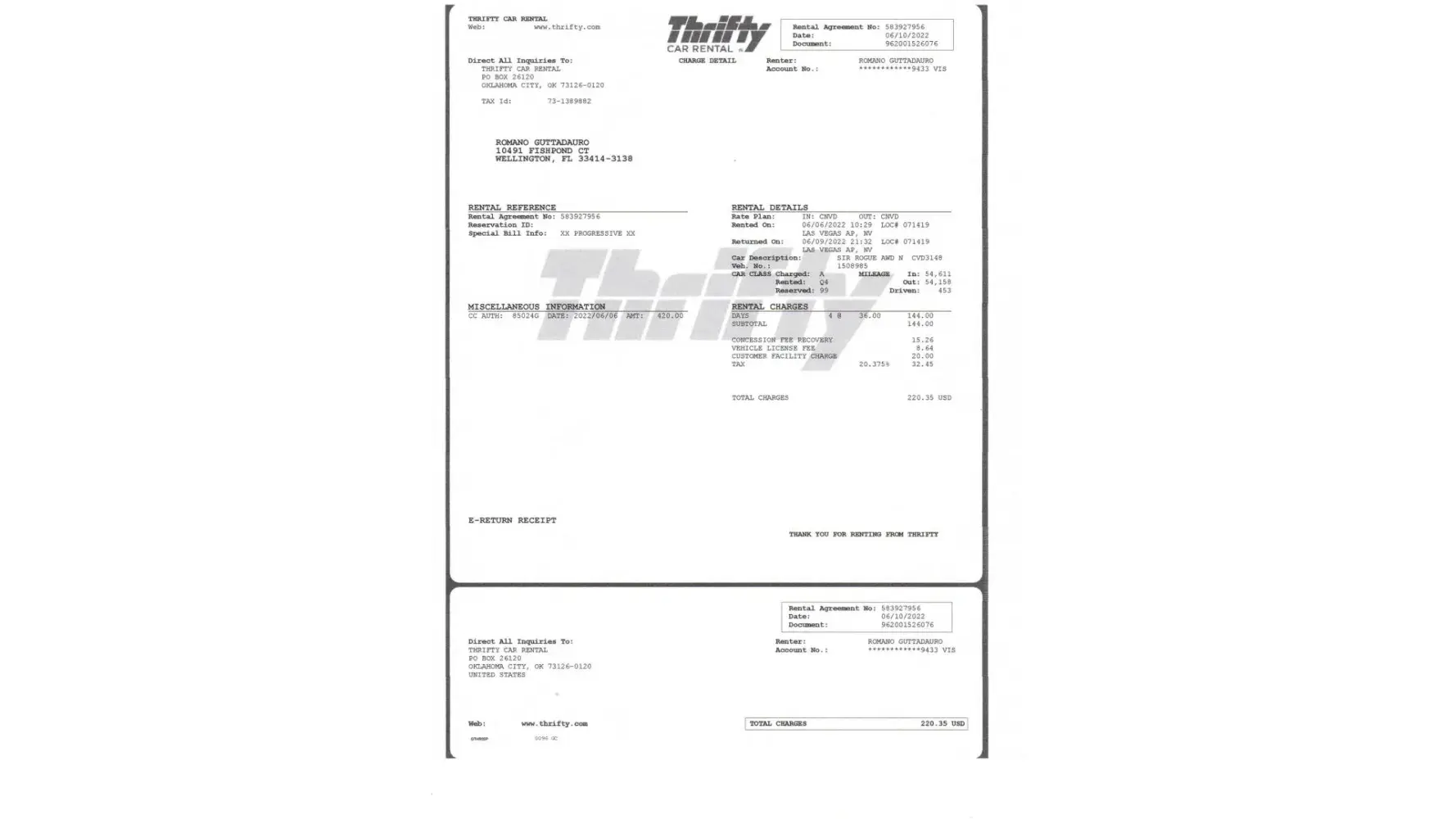 I rented a car from Sixt Car rental Sixt Rent a Car LLC P.O. Box 8188 Fort Lauderdale, FL 33310 United States Face Page of Contract No. [protected] XXX N Customer No: [protected] Time out: 06/02/2022 18.24 Fort Lauderdale Int. No: [protected] Due in: 06/09/2022 06.00 Fort Lauderdale Registr No: FL-JJWH51 Return address: FLL CAR RENTAL CENTER, 600 TERMINAL DR [protected], FORT LAUDERDALE ml Level: 39586 Fuel Gauge: 8/8 Veh. Type: TOYOT RAV4 UTL PCar is parked on: Order No: Res No: [protected] Renter 1: Driver Renter 2: Company EMERICK Expedia Europe c/o Travelscape THERESAM LLC NO ADDITIONAL AUTHORIZED DRIVERS WITHOUT OUR PRIOR WRITTEN CONSENT Rate: USE4F000 IFAR Agent: [protected] * Expedia Europe c/o Travelscape Estimated Total Renter 2 — Number — Unit Price — Subtot. — Rental days (per week) 1 inclusive A1Vehicle License Fee 7 inclusive A1Rental Facility Charge 7 inclusive A1Tire and Battery Fee 7 inclusive A1Rental Surcharge 7 inclusive A1 * Rate includes all mls Excess mileage 1 0.24 USD Tax 7.00 % 0.00 USD Total 0.00 USD This amount includes 6.0% Sales Tax. AP Concession Recovery Fee included Voucher: NA Payment method: CC AMEX Card: 0000 Authorization: 06/03/2022 0.00 USD 06/03/2022 200.00 Merchant-ID: 0 0 Transaktion-ID: 0 Terminal-ID: Receipt No: 0 PayCor-ID: 20602I9SNOGWC3V3EB AID: TVR: TSI: AC: ARC: All designated discounts have been included in the stated final price. This rate is not eligible for the collection of air miles or bonus points. We offer for an additional charge the following optional products: Loss Damage Waiver (LDW), Partial Damage Waiver (PDW), Personal Accident Coverage (PAC), Supplemental Liability Insurance (SLI). Before deciding whether to purchase any of these products you may wish to determine whether your personal insurance or credit card affords you coverage during the rental period. The purchase of any of these products is not required to rent the vehicle. The valid and collectible liability insurance and personal injury protection insurance of any authorized rental or leasing driver is primary for the limits of liability and personal injury protection coverage required by paragraphs 324.021 (7) and 627.736, Florida Statutes. You decline to purchase LDW or PDW, and you agree to be responsible for all damage to, or loss or theft of, the vehicle. You decline to purchase PAC. You decline to purchase any supplemental liability insurance. You accept primary responsibility for, damage or injury you cause to others or their property. Authorized Drivers are the only persons permitted to drive the Vehicle. If you permit anyone other than the Renter or an Additional Driver listed by us above to drive the Vehicle, we will hold you responsible for damage to the Vehicle and for damage to others and their property caused by the unauthorized driver. Damage caused by unauthorized drivers is not covered by Loss Damage Waiver. There is a small fee to add Additional Drivers to this Agreement. You decline to purchase fuel in advance. You must return the Vehicle with at least as much fuel as when rented. If the Vehicle is returned with less fuel than when rented, you will pay us for the fuel used at USD 11.99 per gallon, plus tax. This vehicle's license plate is registered with Toll-By-Plate, a Florida toll road express lane service. Each time you drive the Vehicle through an automated express lane, the license plate is photographed and we are noti - fied that you used the Express Lane. We offer Toll Express Service (TX), a a fee service that permits you to use automated express lanes within Florida without paying a toll at the time you drive through.